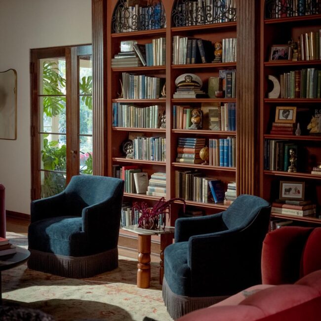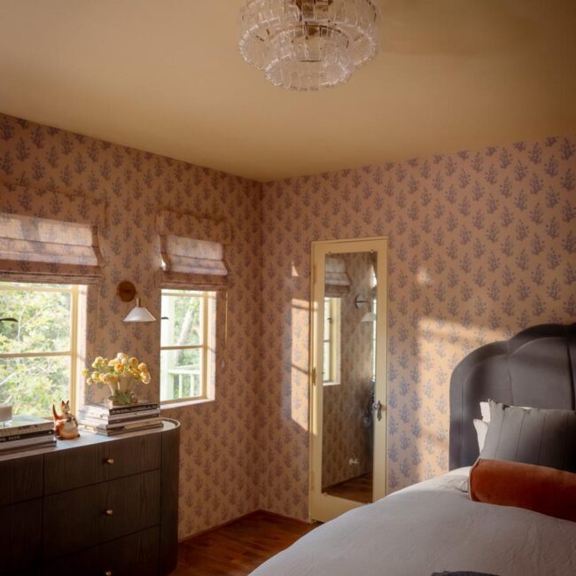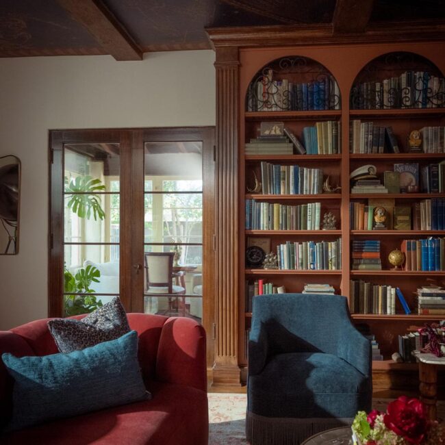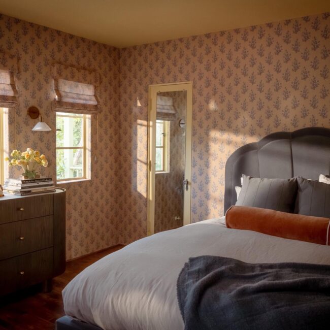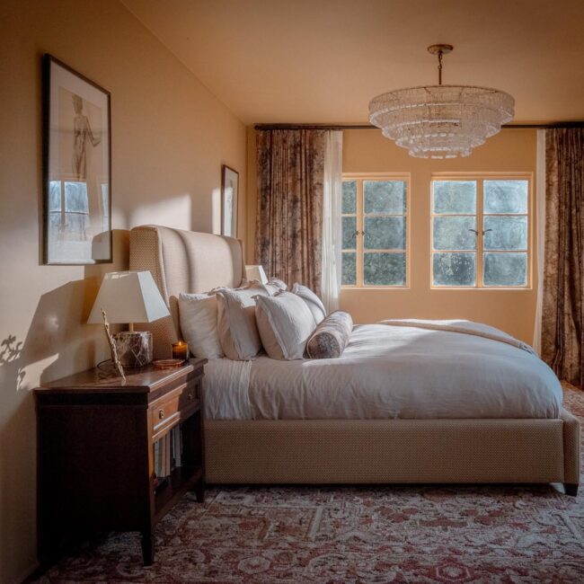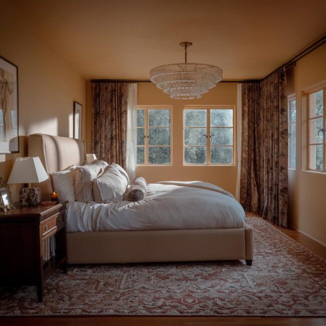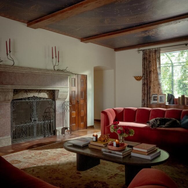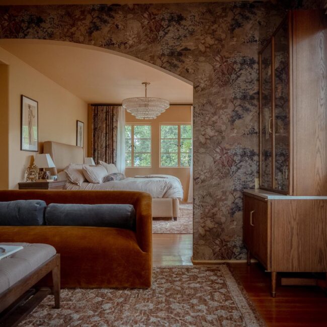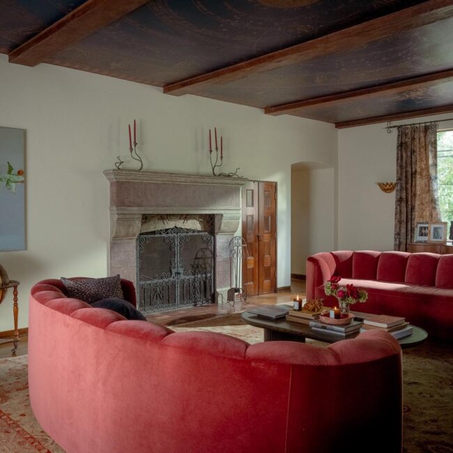 The lower level, once a concrete basement, has been transformed into a Hollywood Regency–inspired speakeasy and private screening room—dark, intimate, and deliberately theatrical. Upstairs, bedrooms open to balconies and fireplaces, maintaining a sense of privacy and proportion.