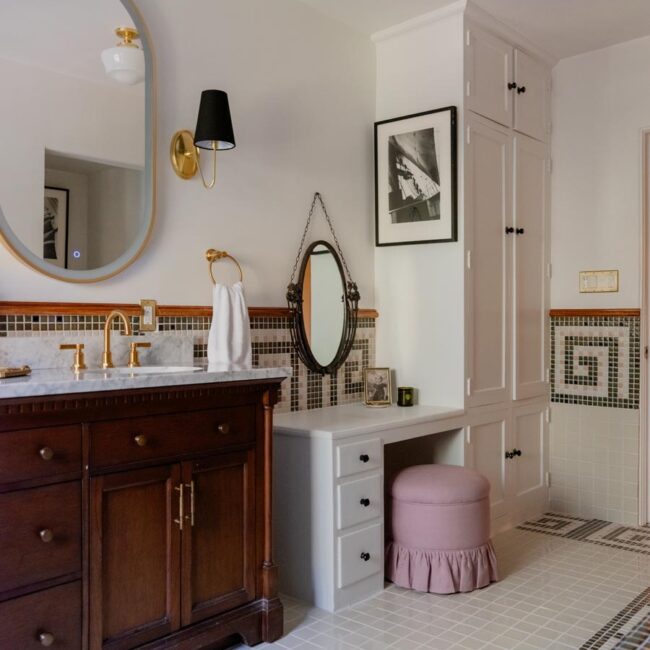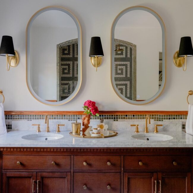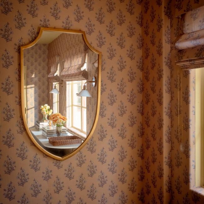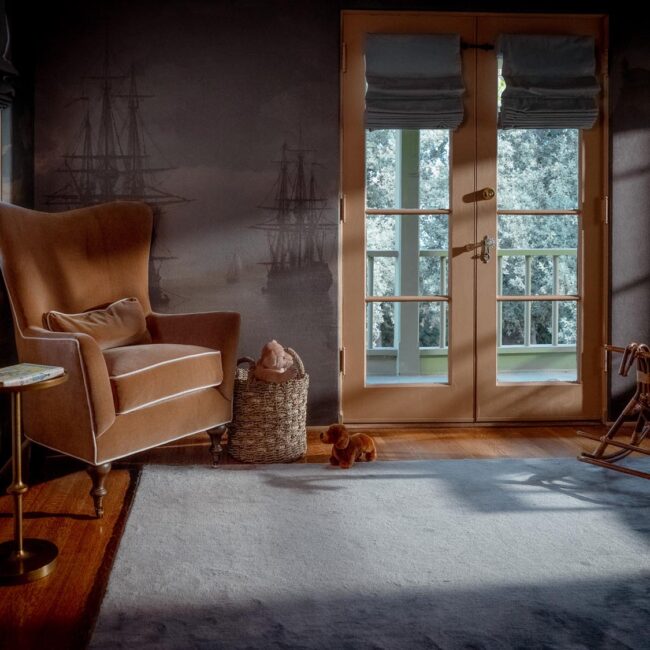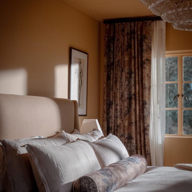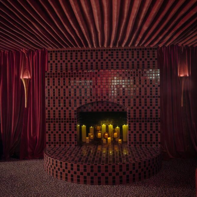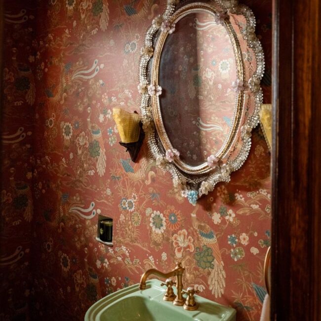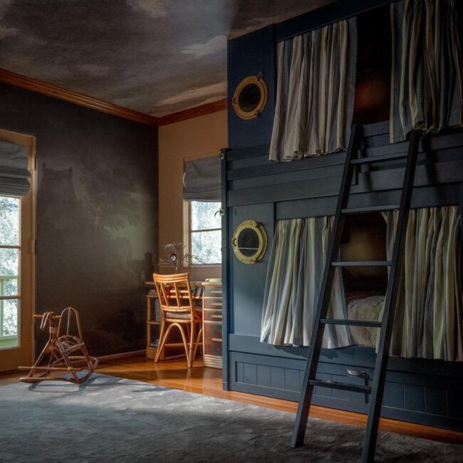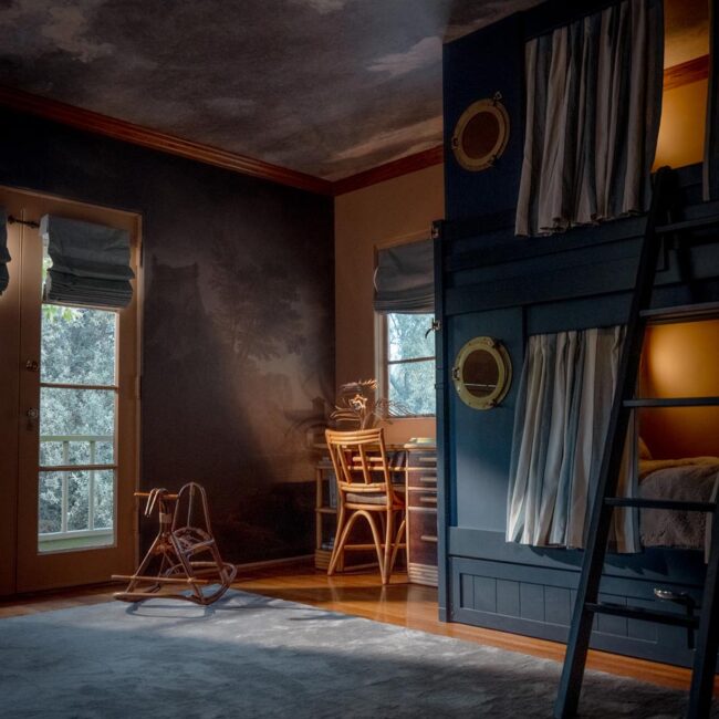 The lower level, once a concrete basement, has been transformed into a Hollywood Regency–inspired speakeasy and private screening room—dark, intimate, and deliberately theatrical. Upstairs, bedrooms open to balconies and fireplaces, maintaining a sense of privacy and proportion.
