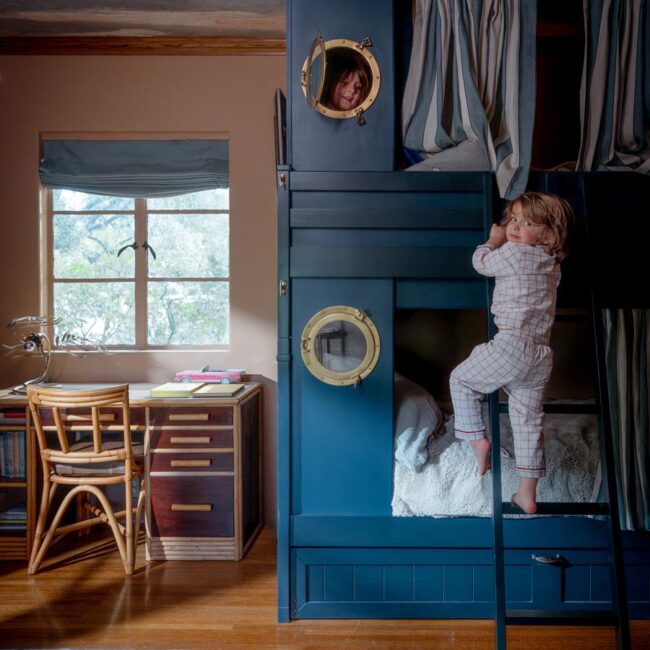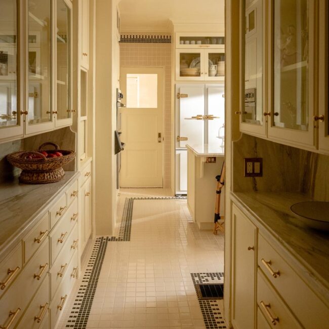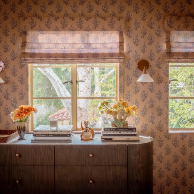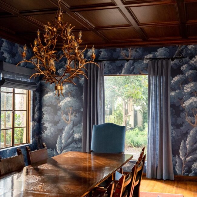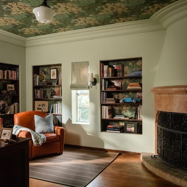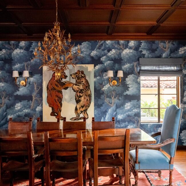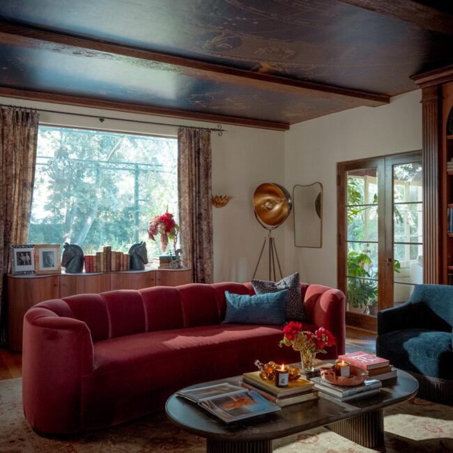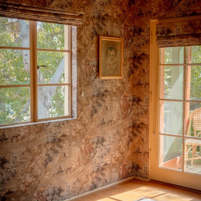 Custom, period-appropriate interventions define the interiors. Hand-glazed California tile runs throughout, paired with barkcloth-inspired wallcoverings and bespoke murals. A nearly thirty-foot celestial zodiac ceiling stretches overhead, anchoring the house in myth and spectacle. Antique art, books, and collected objects lend depth and authenticity, creating spaces that feel composed rather than styled.