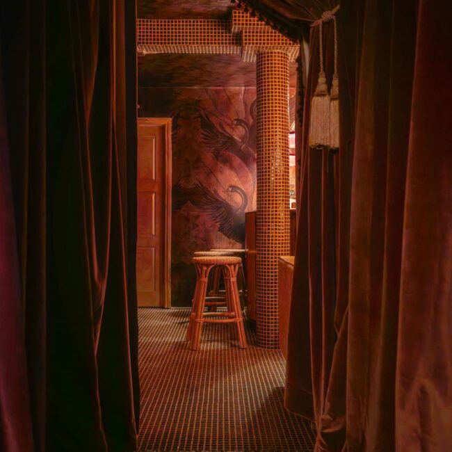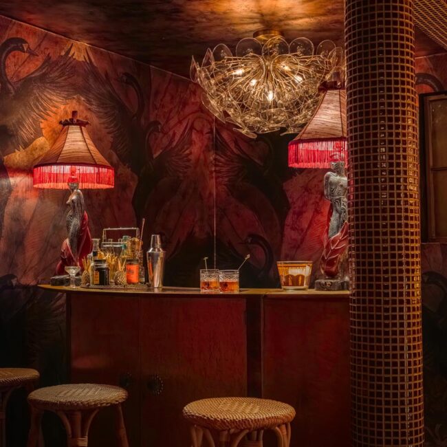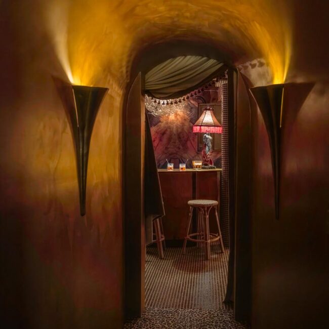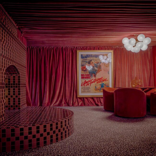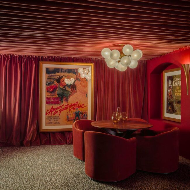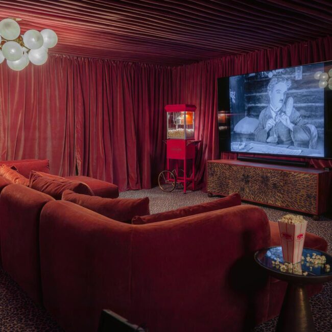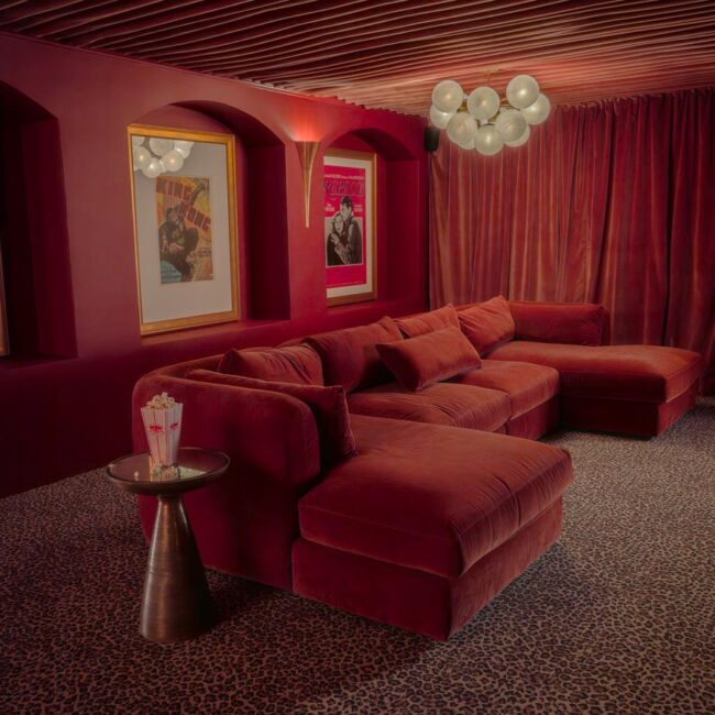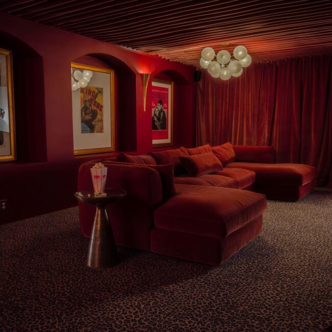 - Hollywood Regency–inspired speakeasy and private screening room