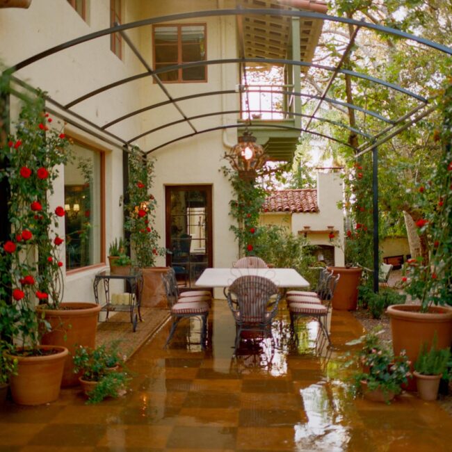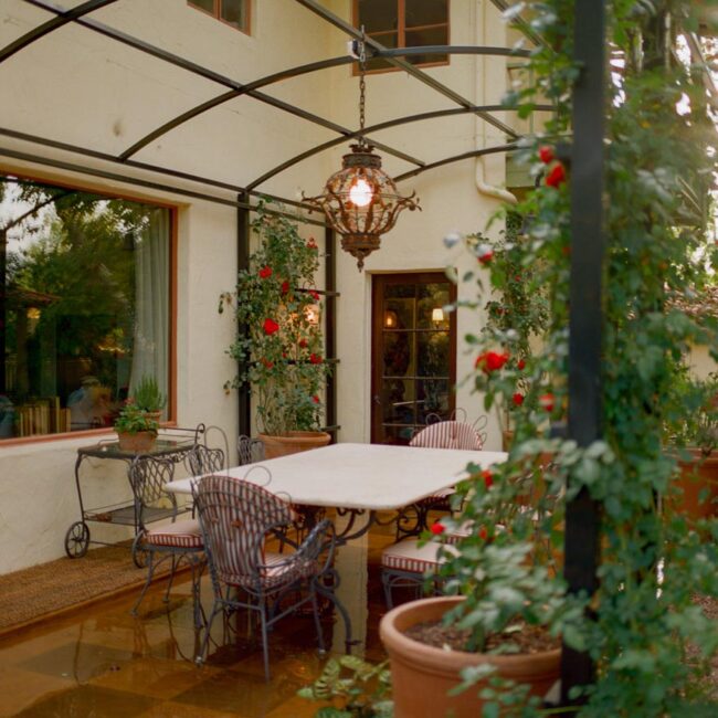 - Rose-covered tunnel framing an outdoor dining room