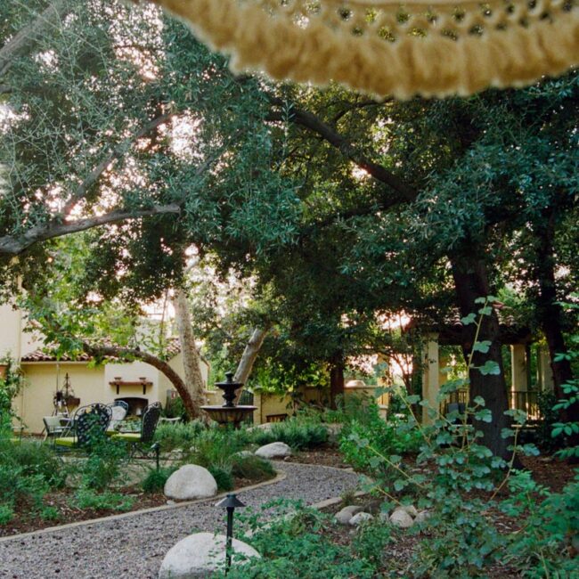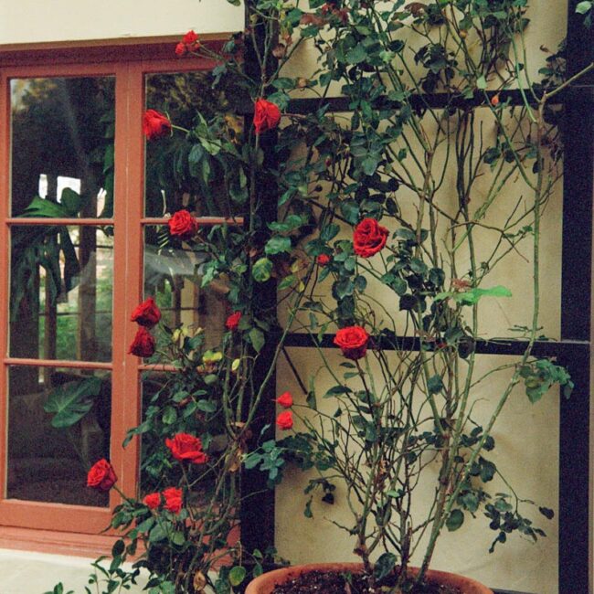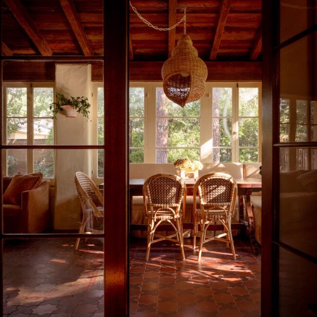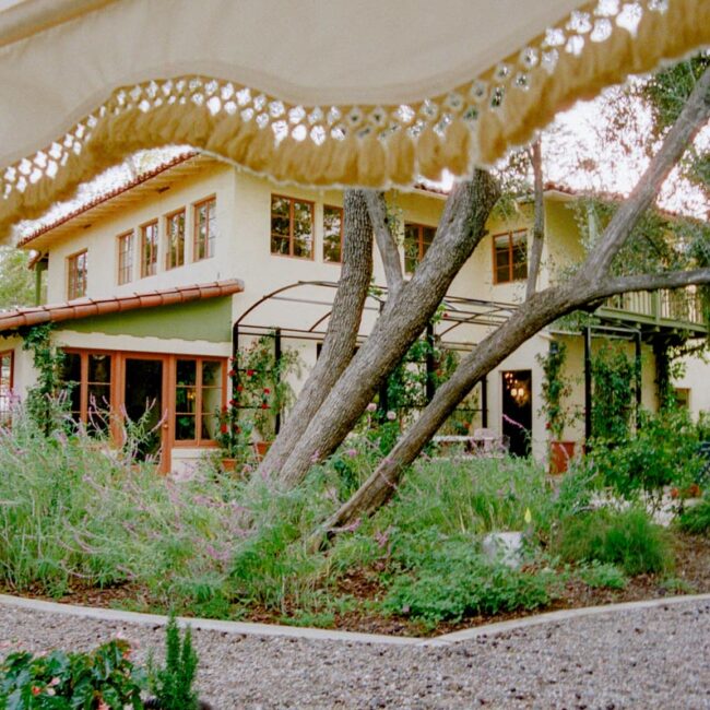 Outside, a rose-covered tunnel frames the outdoor dining room, set among pergolas, old-growth trees, and garden paths. The result is a house that feels architectural at its core, cinematic in spirit, and unmistakably transportive.