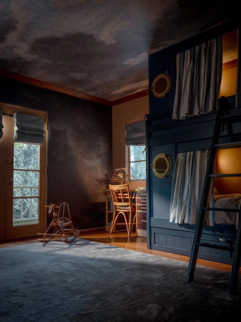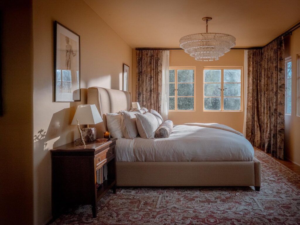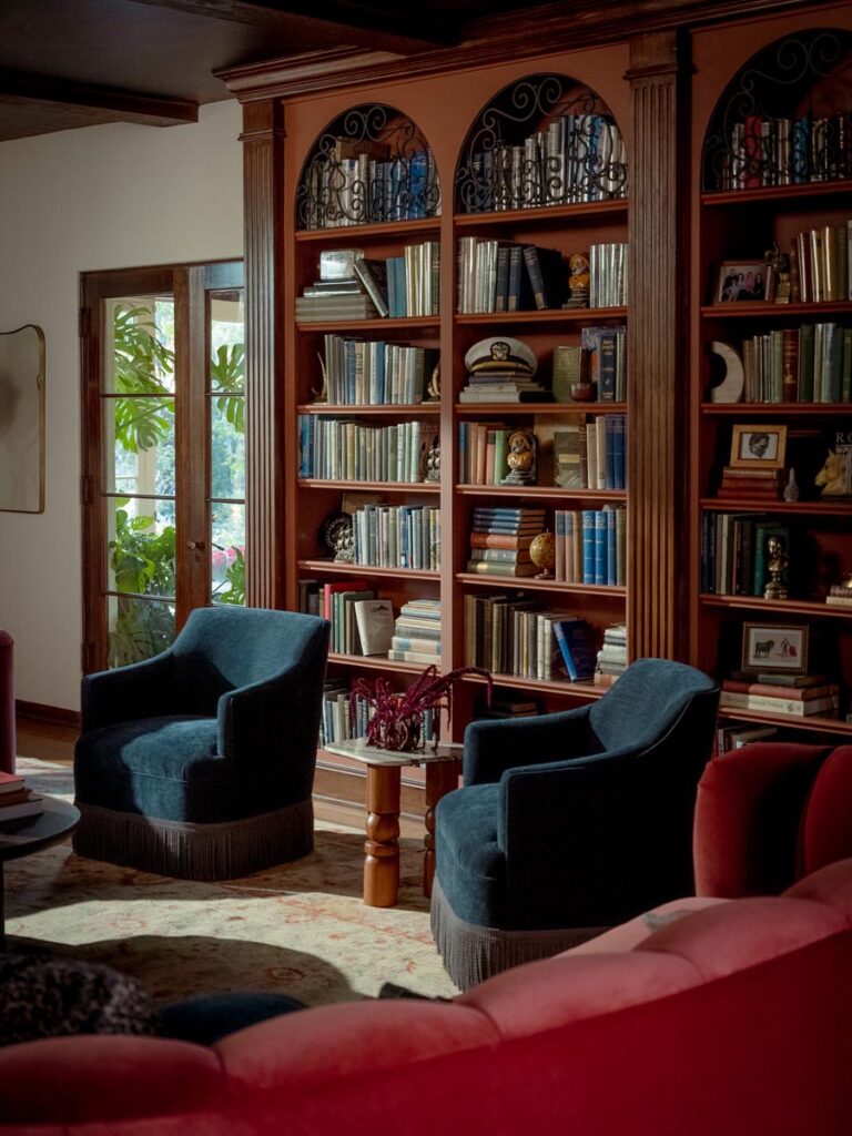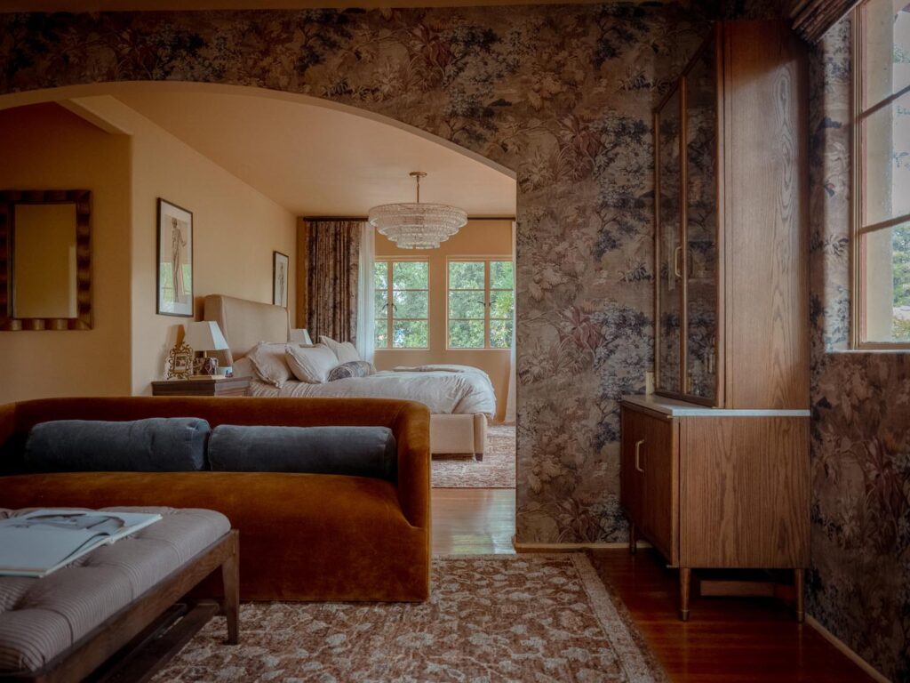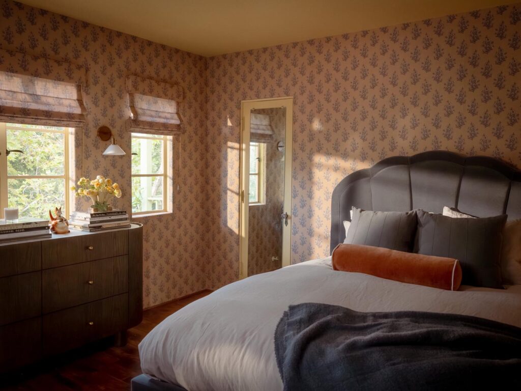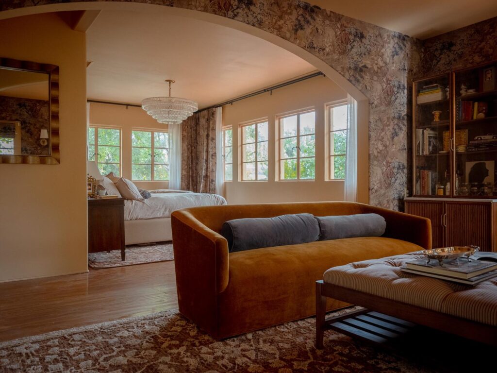 The lower level, once a concrete basement, has been transformed into a Hollywood Regency–inspired speakeasy and private screening room—dark, intimate, and deliberately theatrical. Upstairs, bedrooms open to balconies and fireplaces, maintaining a sense of privacy and proportion.