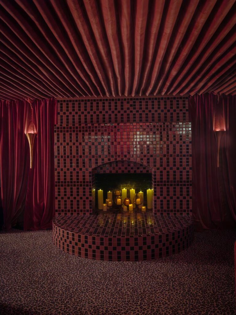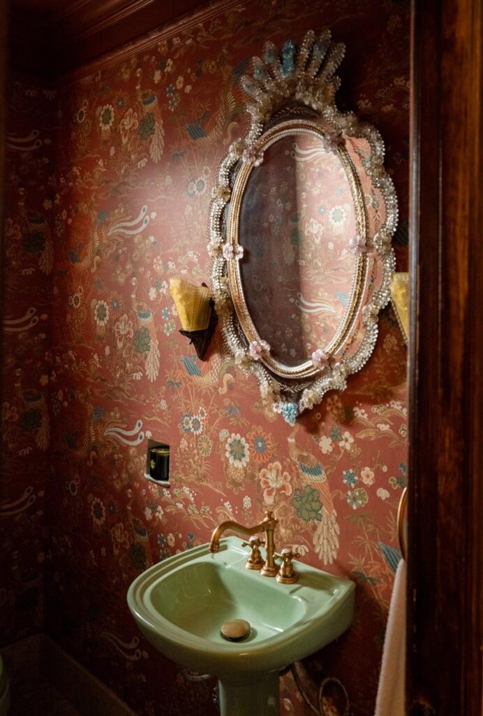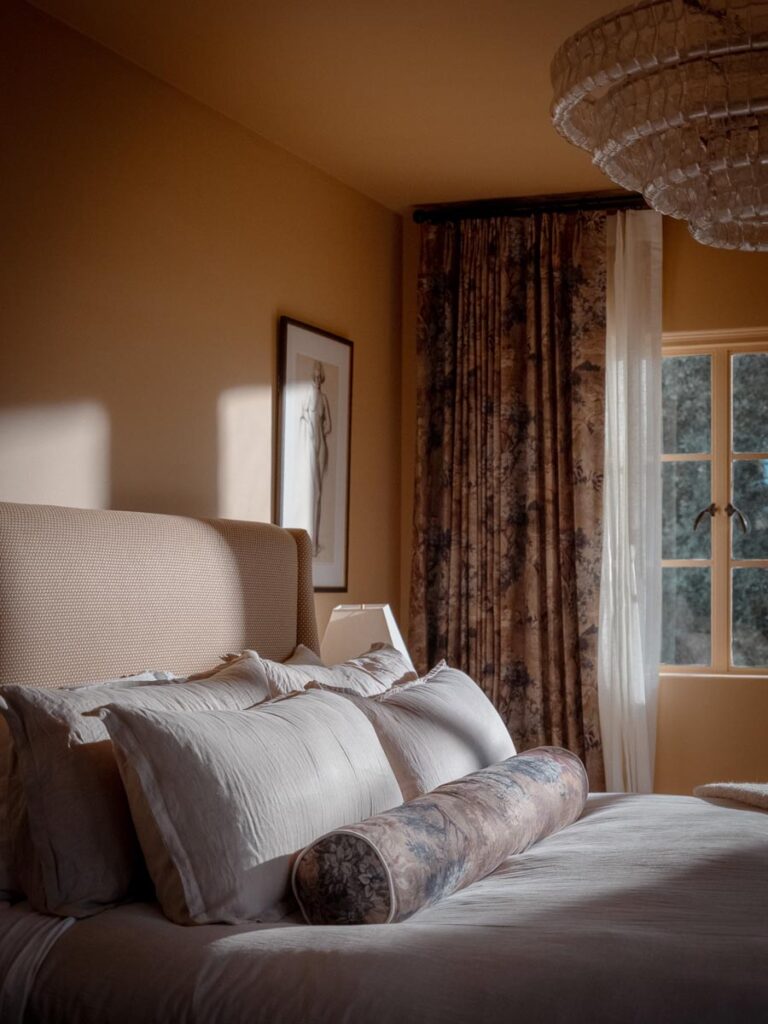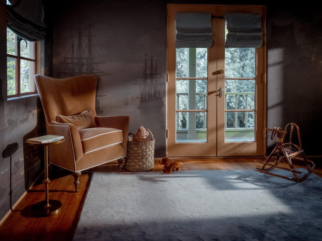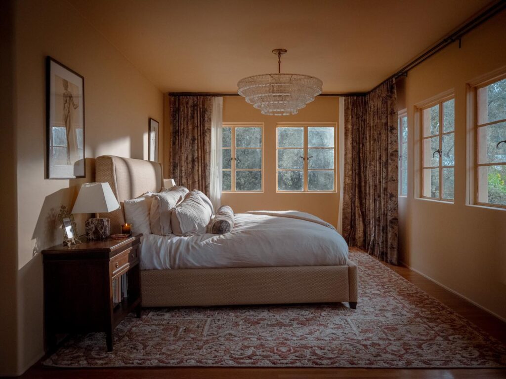 The lower level, once a concrete basement, has been transformed into a Hollywood Regency–inspired speakeasy and private screening room—dark, intimate, and deliberately theatrical. Upstairs, bedrooms open to balconies and fireplaces, maintaining a sense of privacy and proportion.