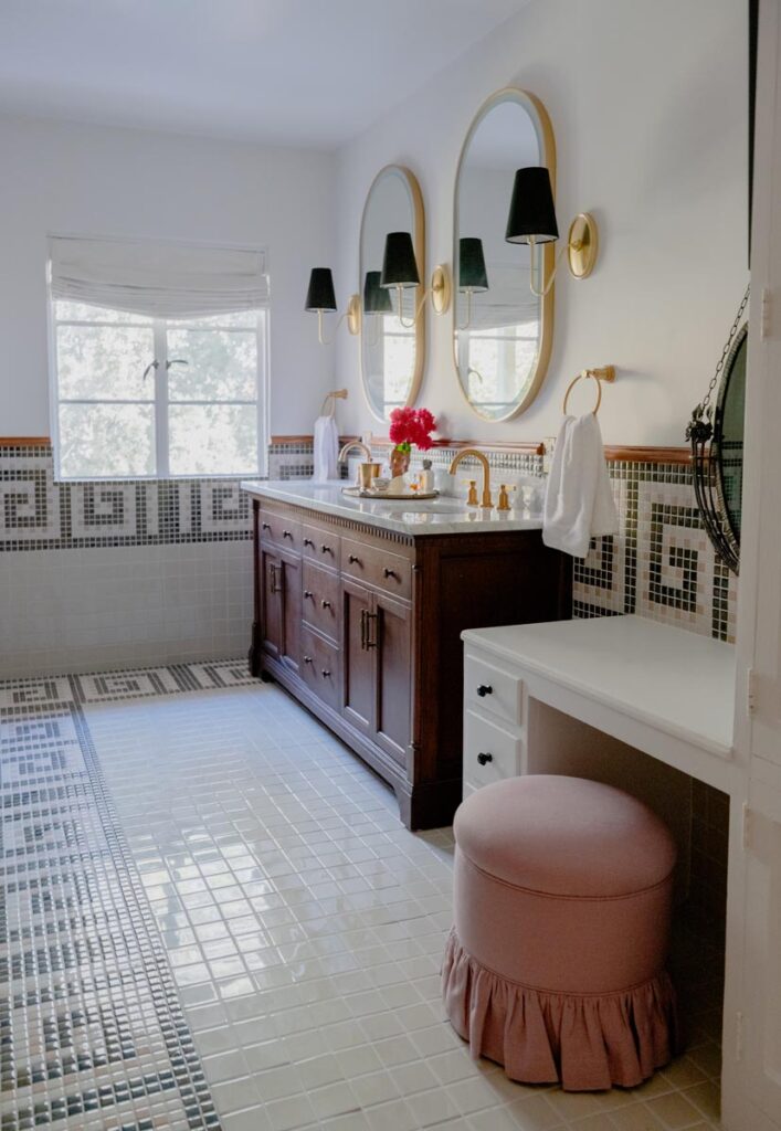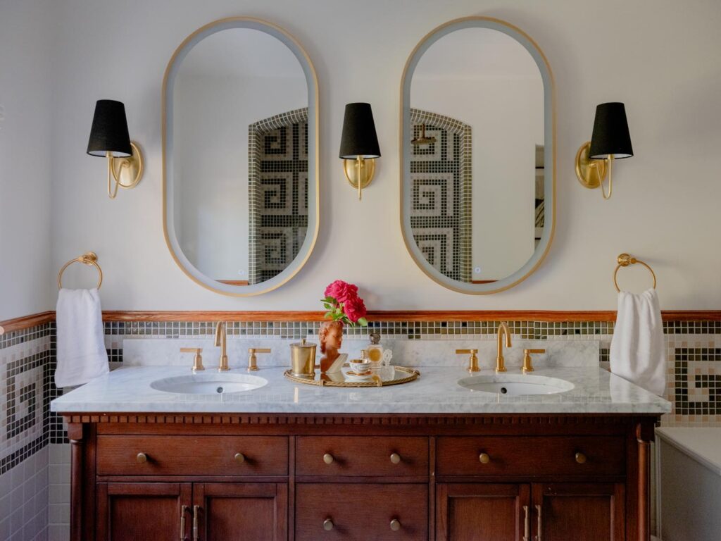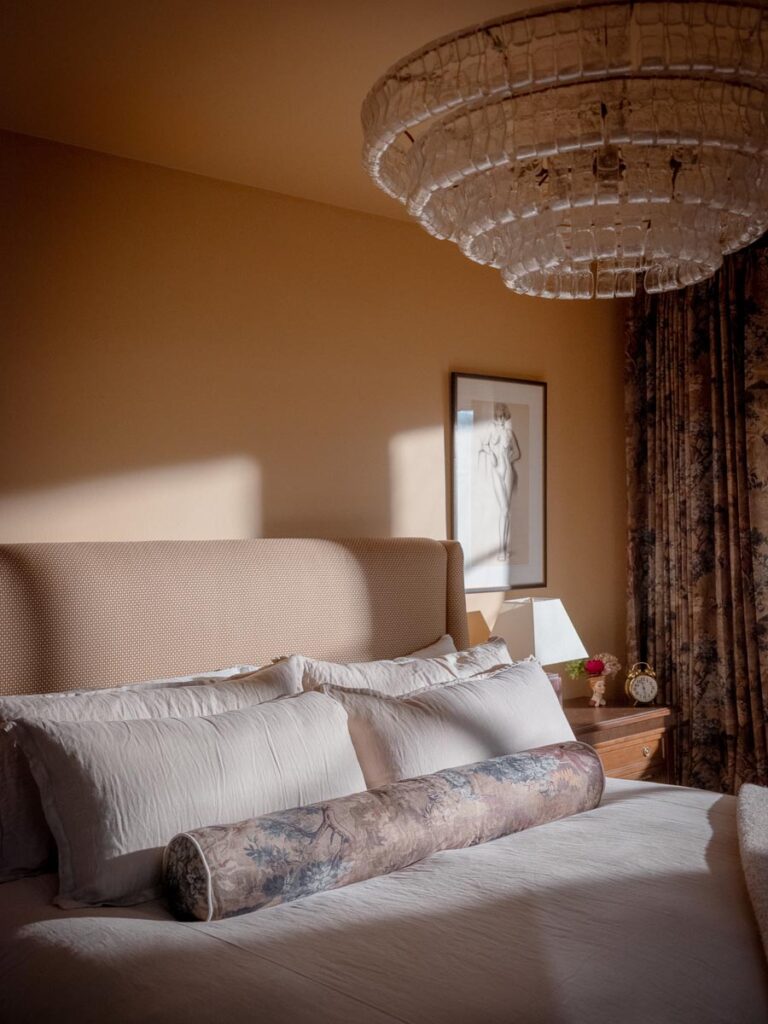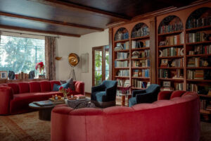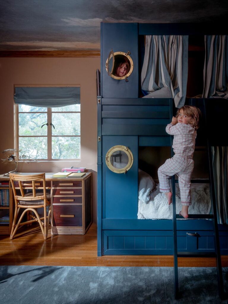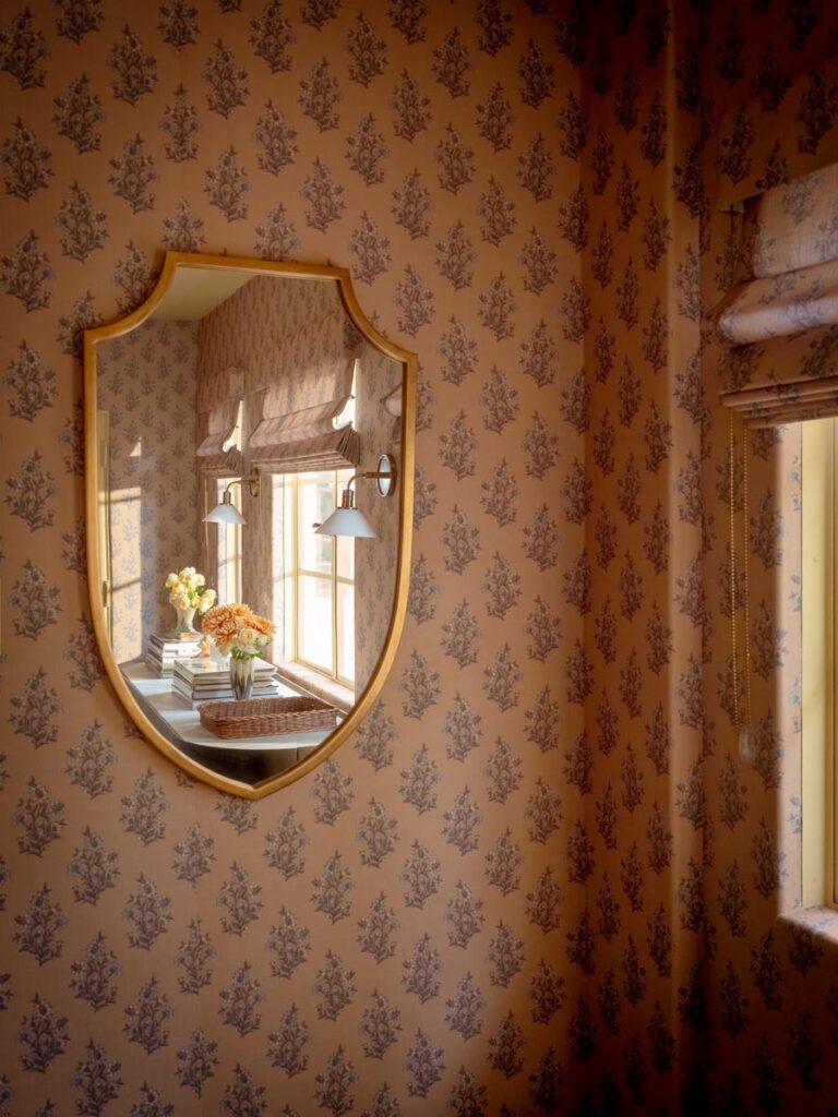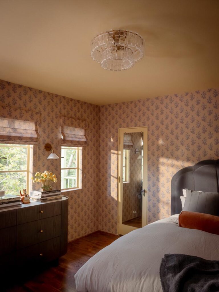 The lower level, once a concrete basement, has been transformed into a Hollywood Regency–inspired speakeasy and private screening room—dark, intimate, and deliberately theatrical. Upstairs, bedrooms open to balconies and fireplaces, maintaining a sense of privacy and proportion.