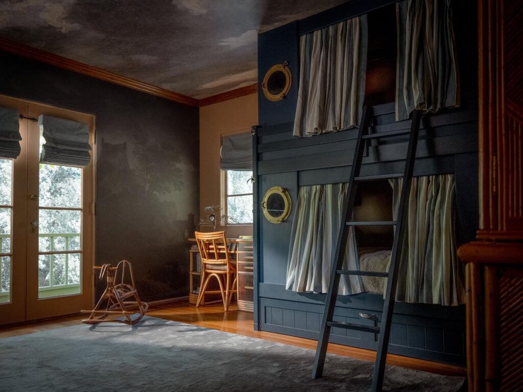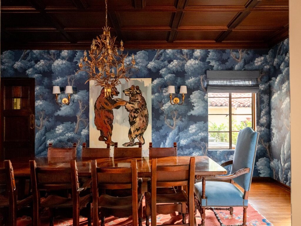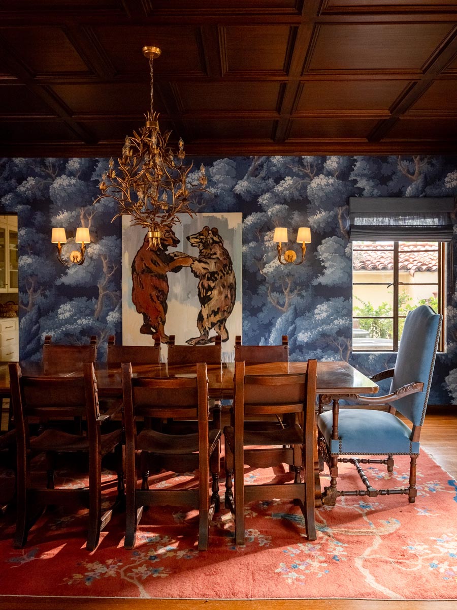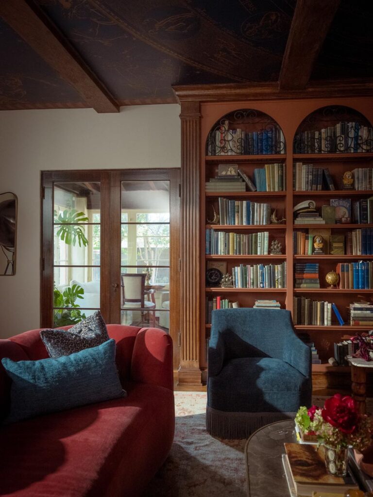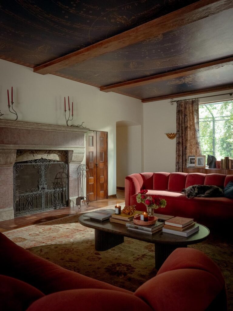 Custom, period-appropriate interventions define the interiors. Hand-glazed California tile runs throughout, paired with barkcloth-inspired wallcoverings and bespoke murals. A nearly thirty-foot celestial zodiac ceiling stretches overhead, anchoring the house in myth and spectacle. Antique art, books, and collected objects lend depth and authenticity, creating spaces that feel composed rather than styled.
