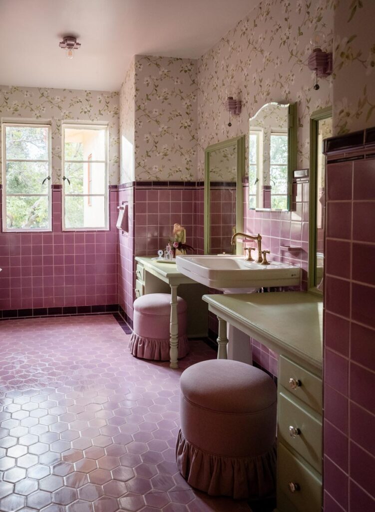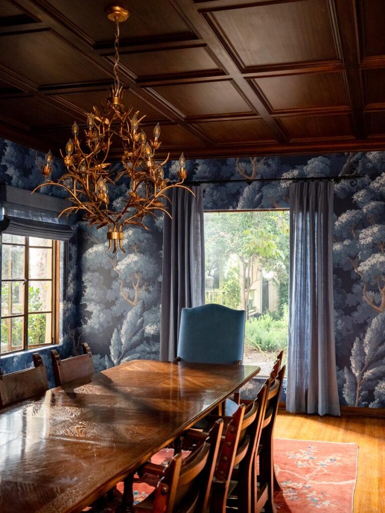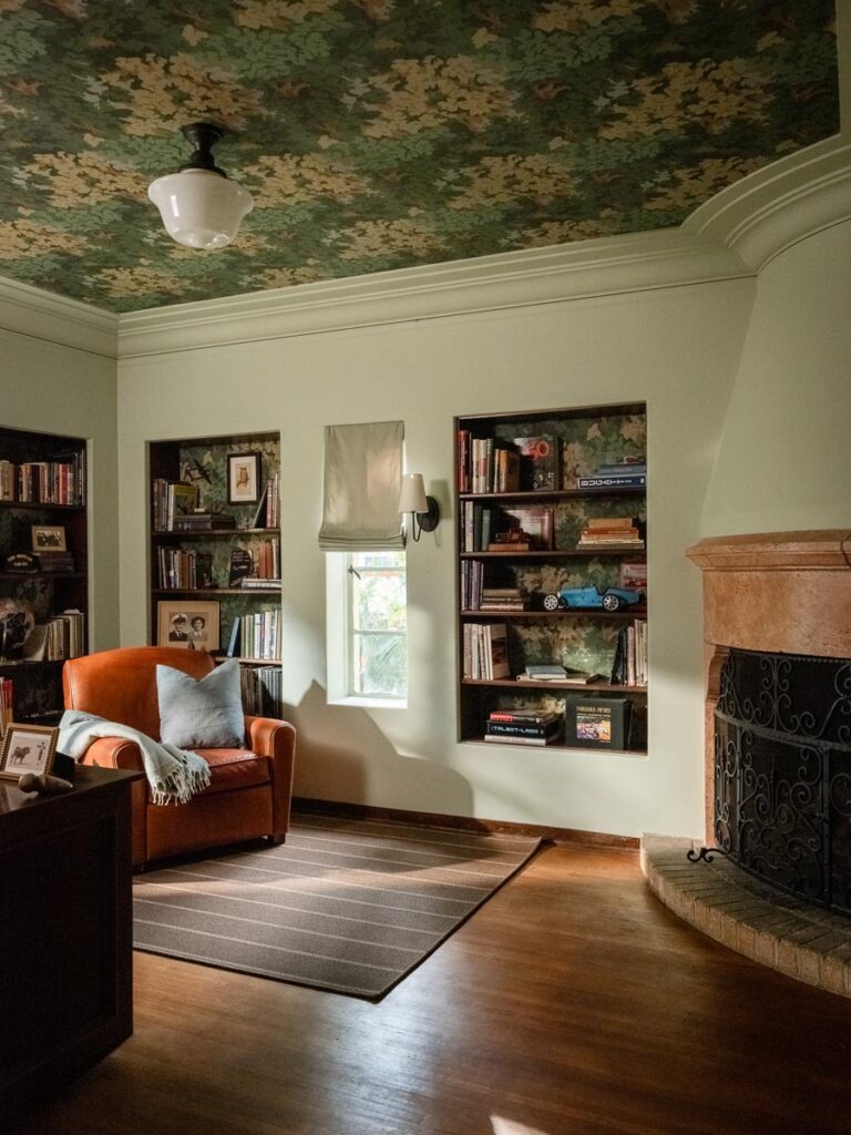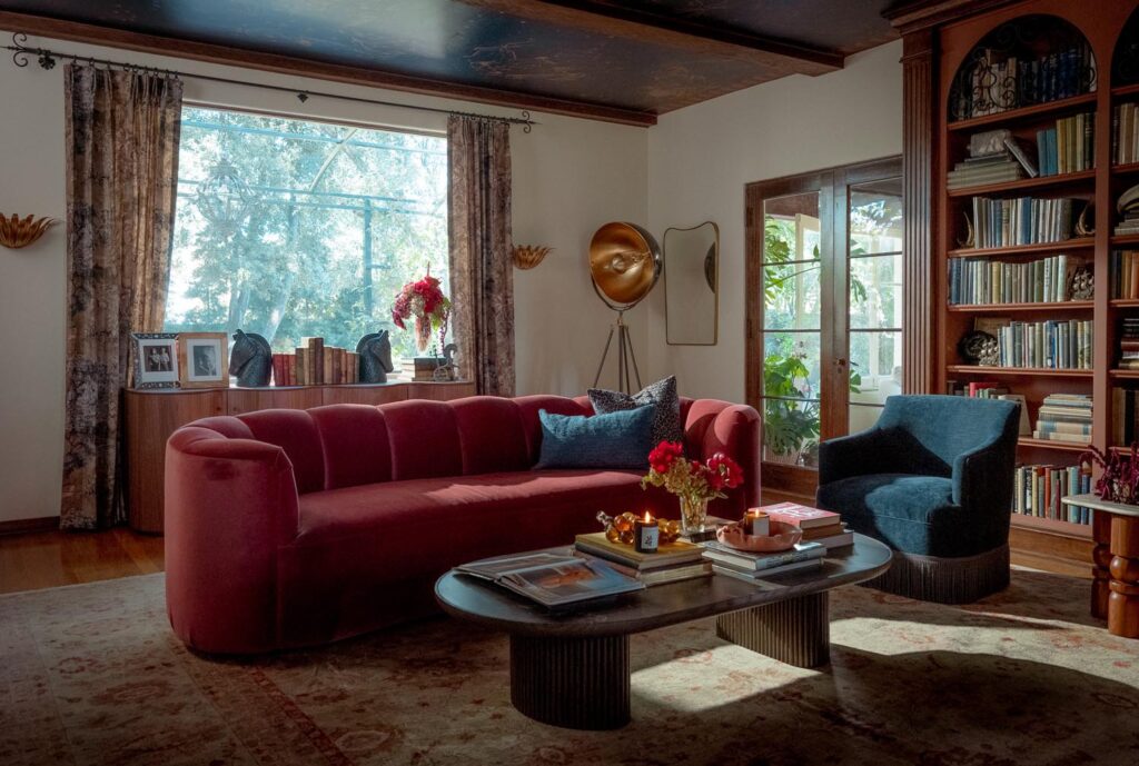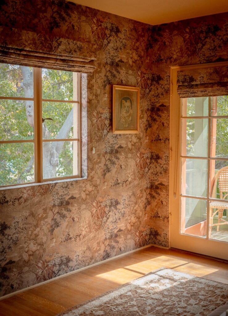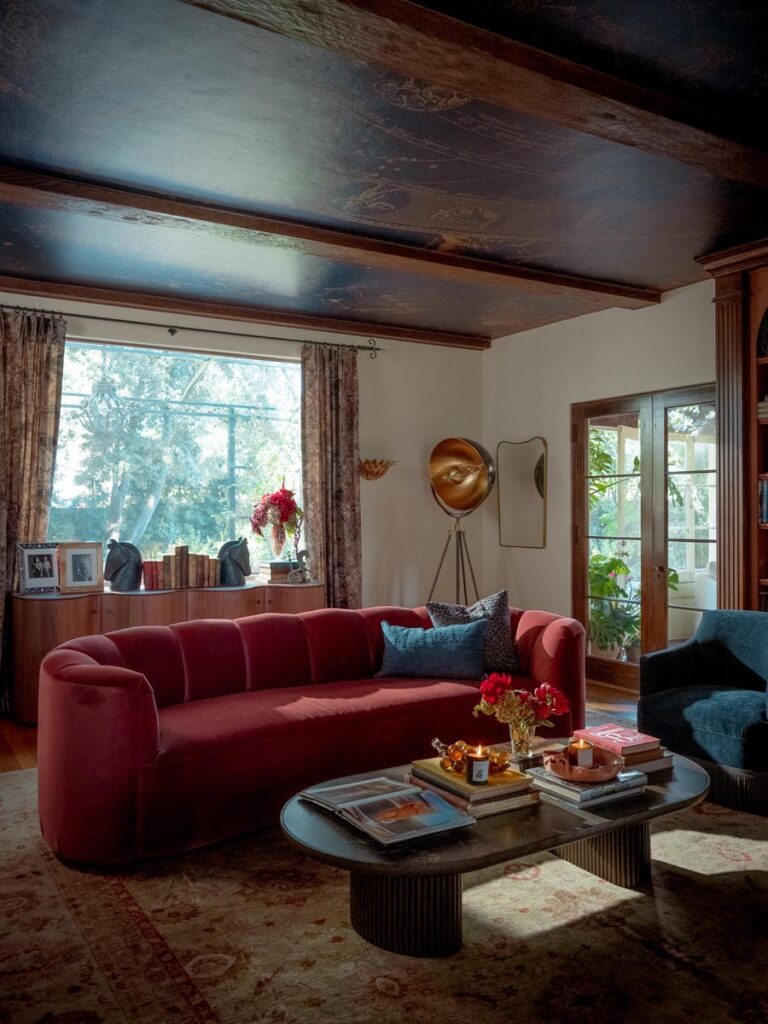 Custom, period-appropriate interventions define the interiors. Hand-glazed California tile runs throughout, paired with barkcloth-inspired wallcoverings and bespoke murals. A nearly thirty-foot celestial zodiac ceiling stretches overhead, anchoring the house in myth and spectacle. Antique art, books, and collected objects lend depth and authenticity, creating spaces that feel composed rather than styled.