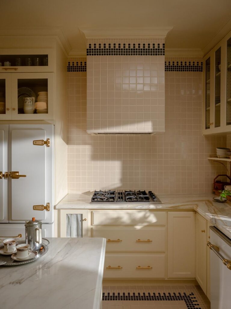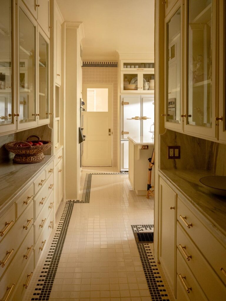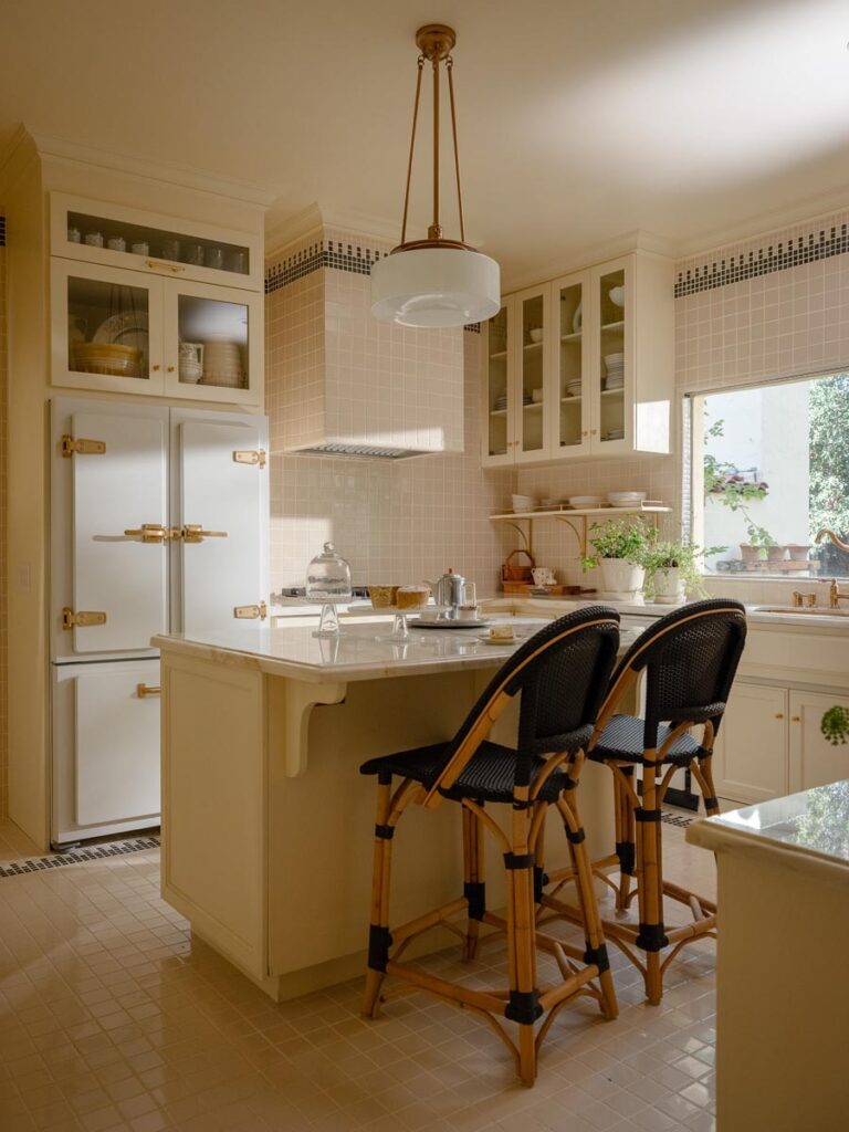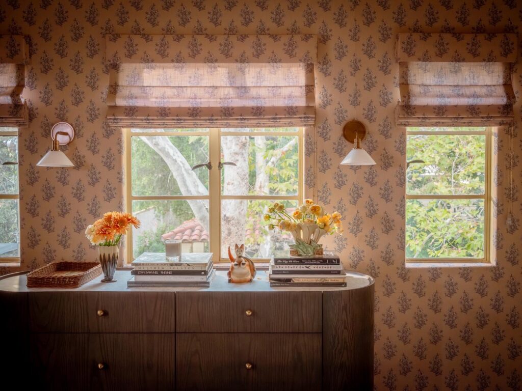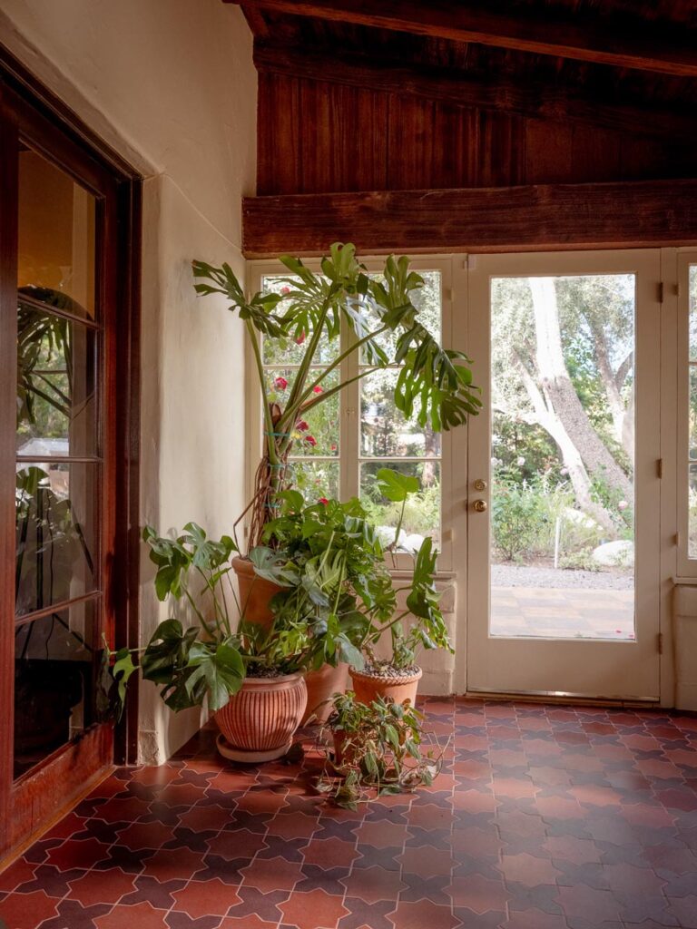 Custom, period-appropriate interventions define the interiors. Hand-glazed California tile runs throughout, paired with barkcloth-inspired wallcoverings and bespoke murals. A nearly thirty-foot celestial zodiac ceiling stretches overhead, anchoring the house in myth and spectacle. Antique art, books, and collected objects lend depth and authenticity, creating spaces that feel composed rather than styled.