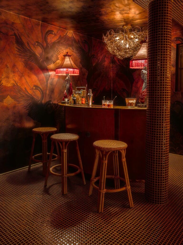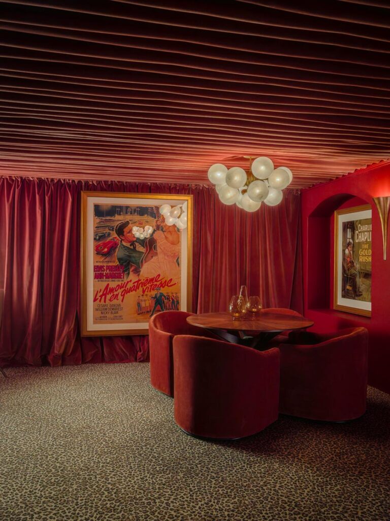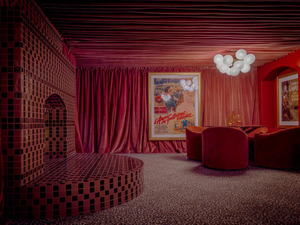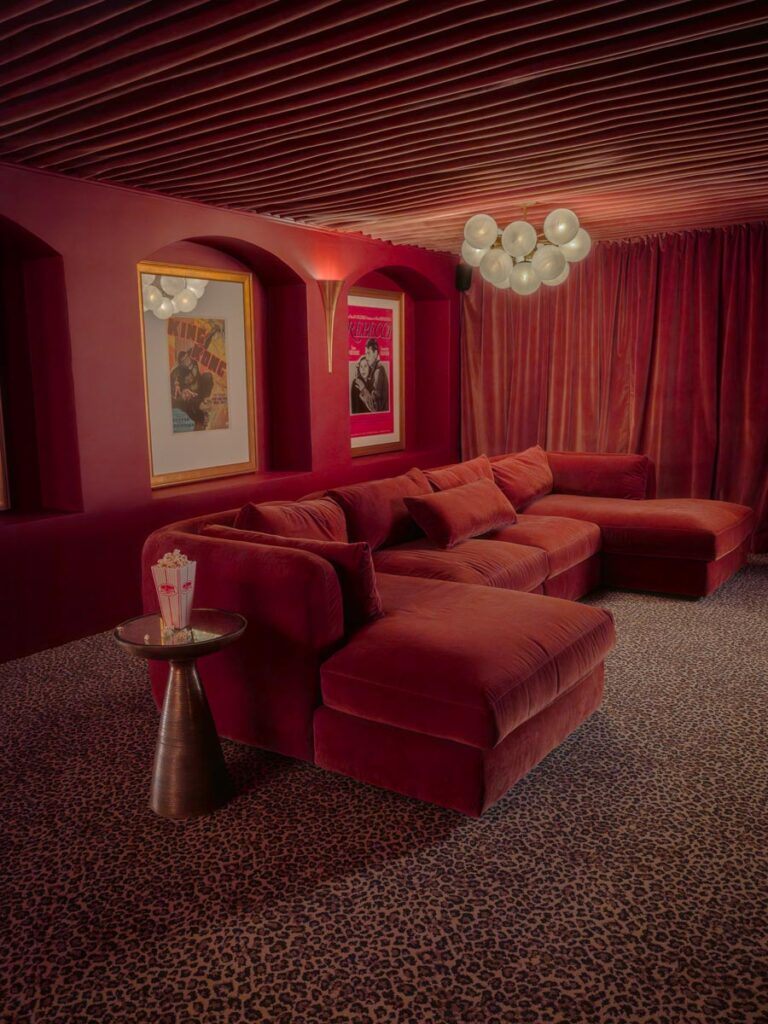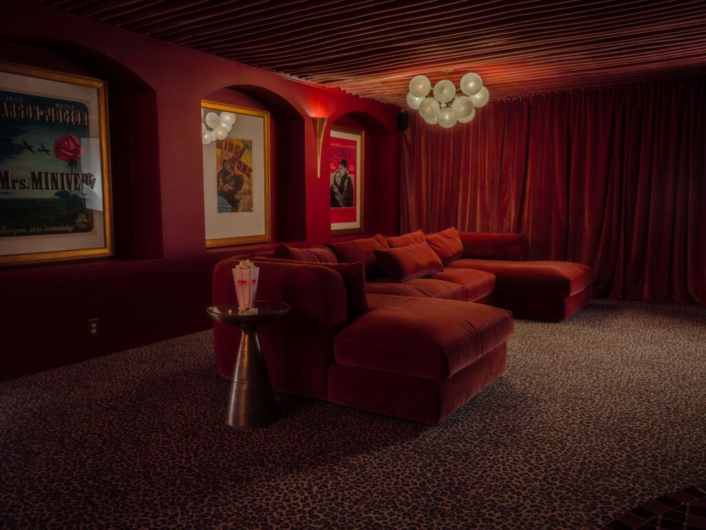 - Hollywood Regency–inspired speakeasy and private screening room
