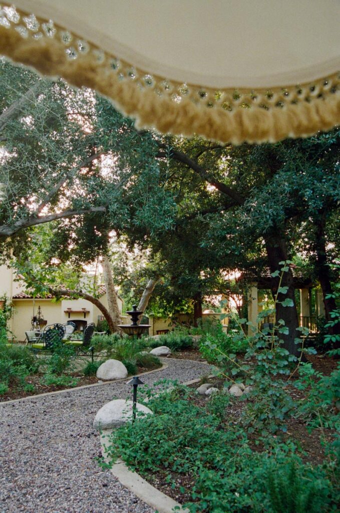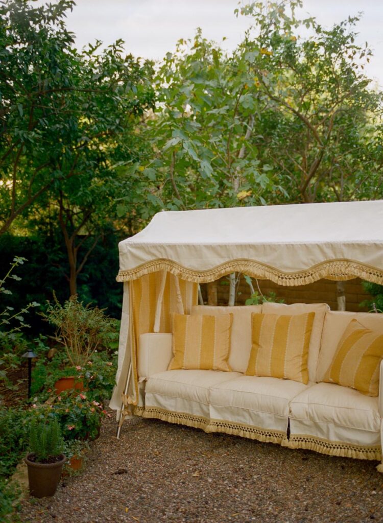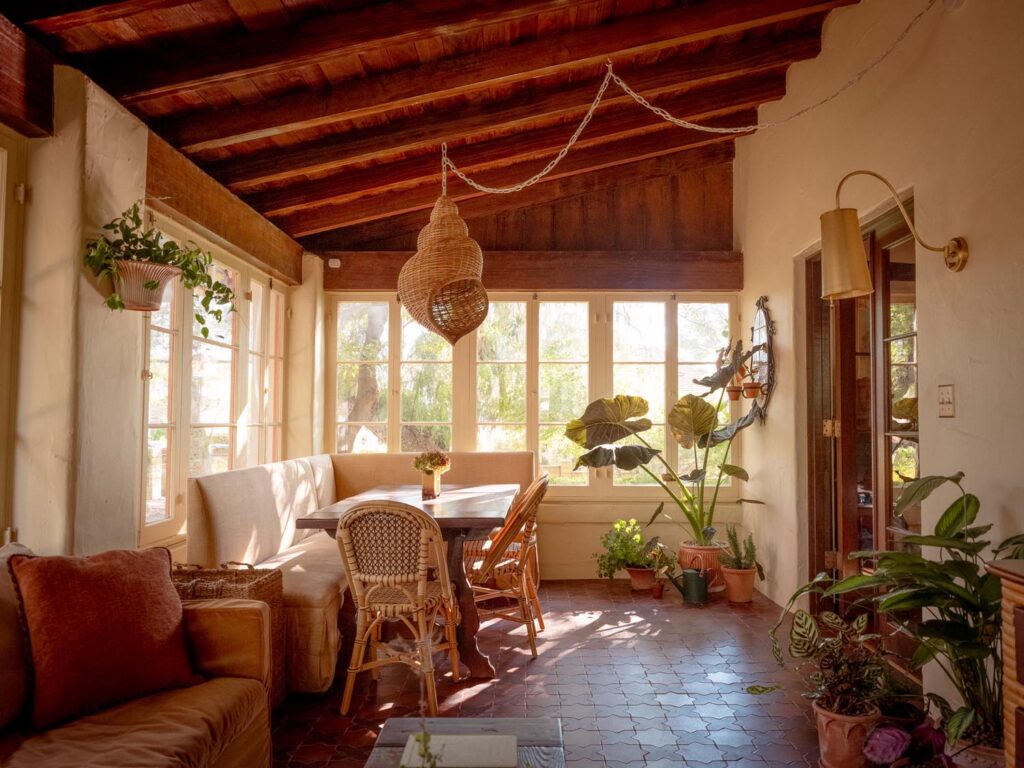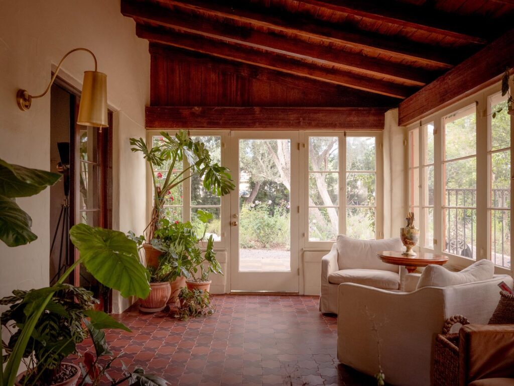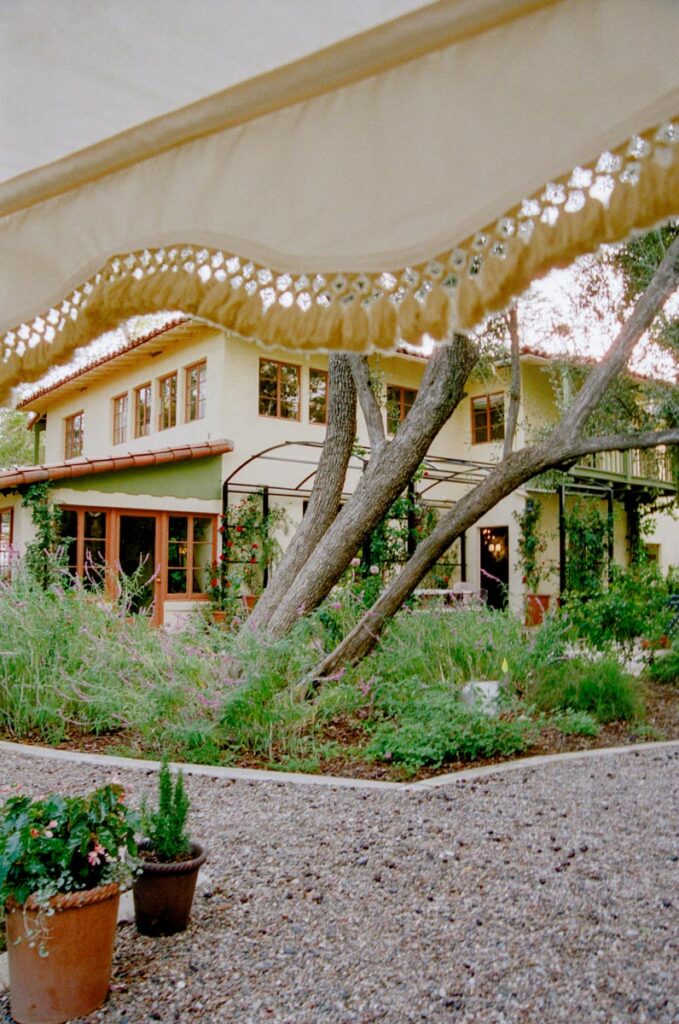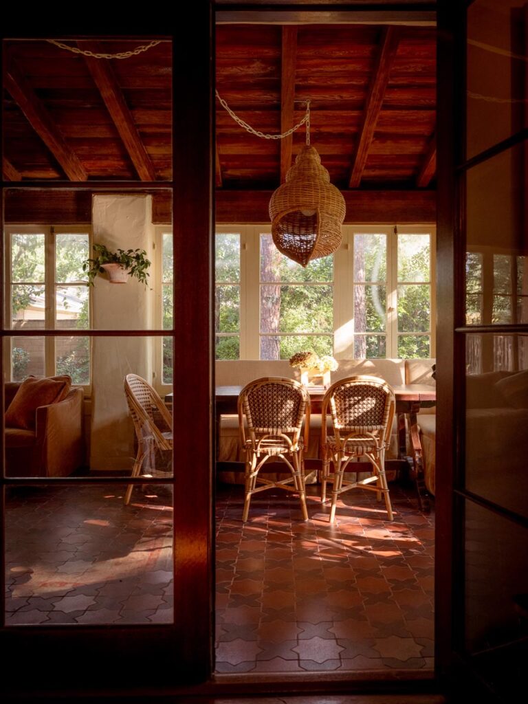Outside, a rose-covered tunnel frames the outdoor dining room, set among pergolas, old-growth trees, and garden paths. The result is a house that feels architectural at its core, cinematic in spirit, and unmistakably transportive.