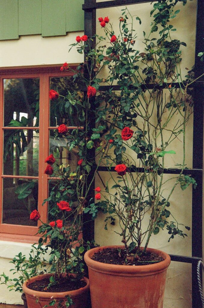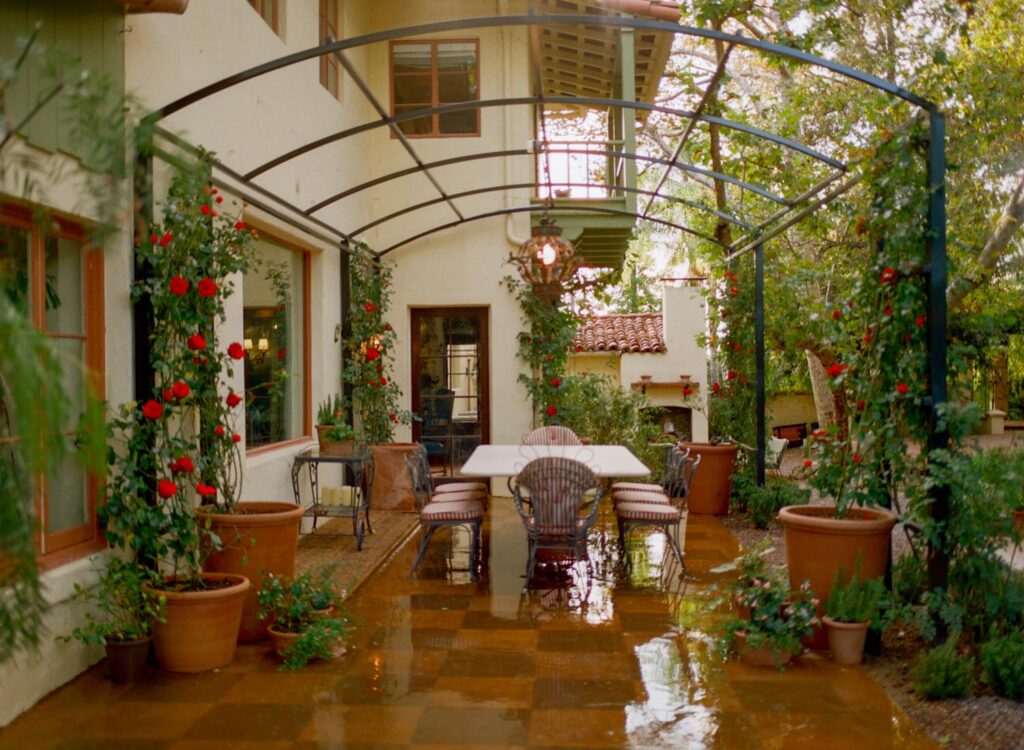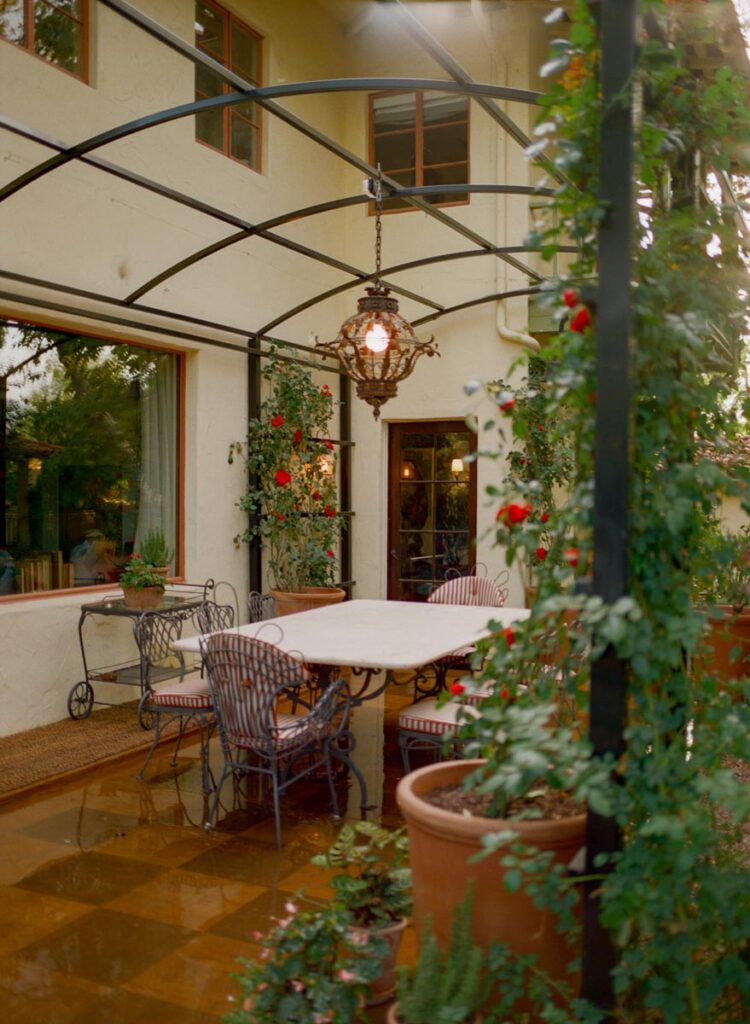 - Rose-covered tunnel framing an outdoor dining room