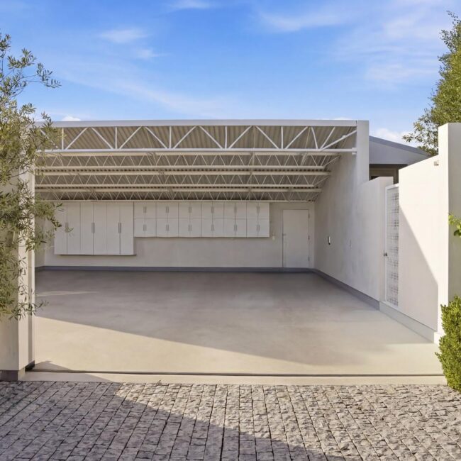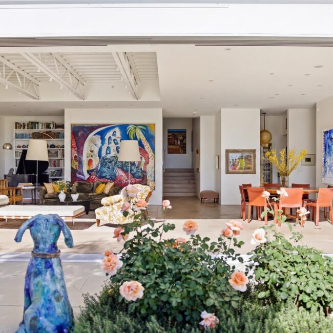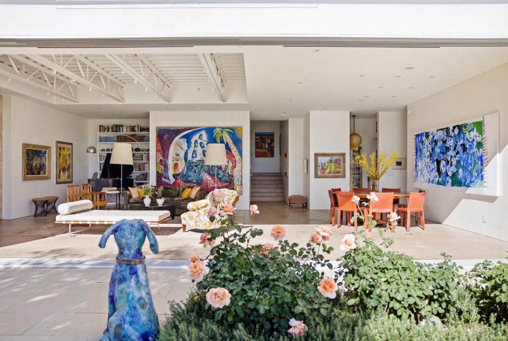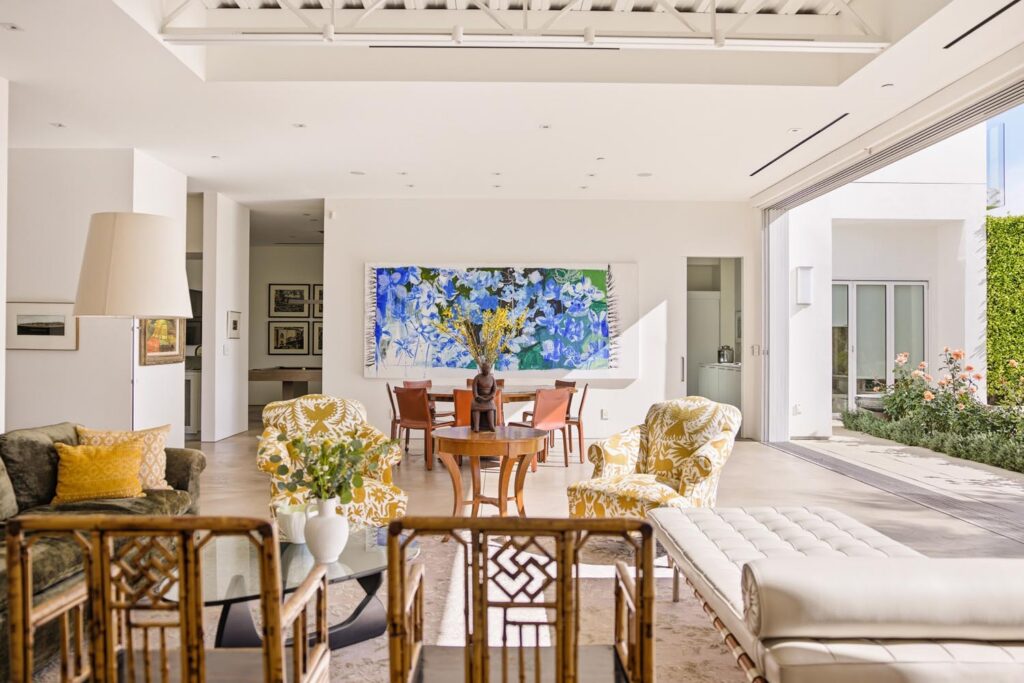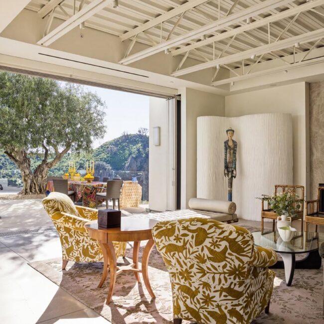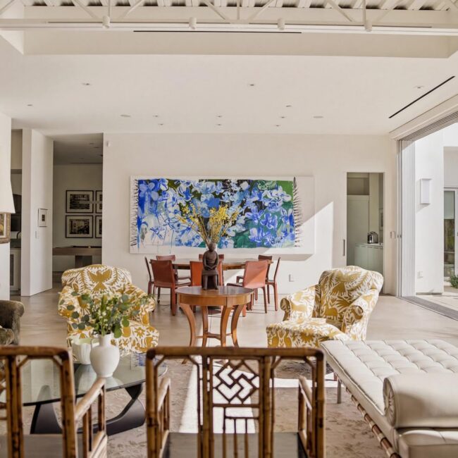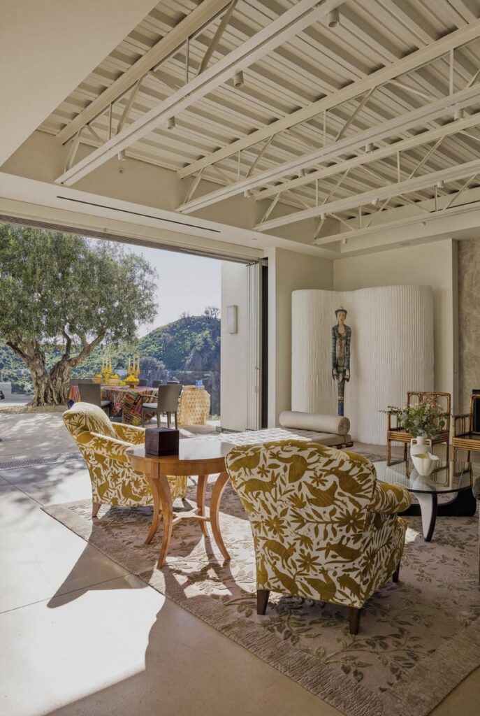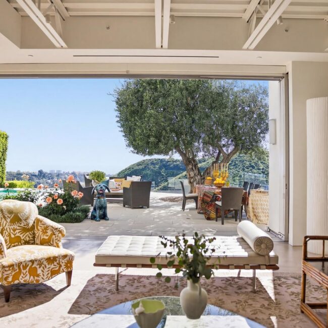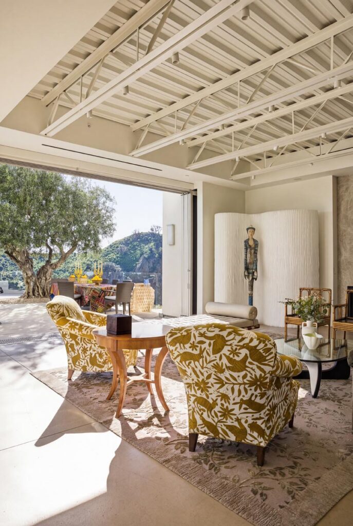 The home itself is defined by scale, clarity, and light. Expansive glass pocket doors dissolve the boundary between interior and exterior, opening the primary living space to a wide terrace and pool framed by mature hedges and an old olive tree. Polished concrete floors, white steel trusses, and restrained architectural lines create a clean, modern canvas softened by layered furnishings and collected artwork.