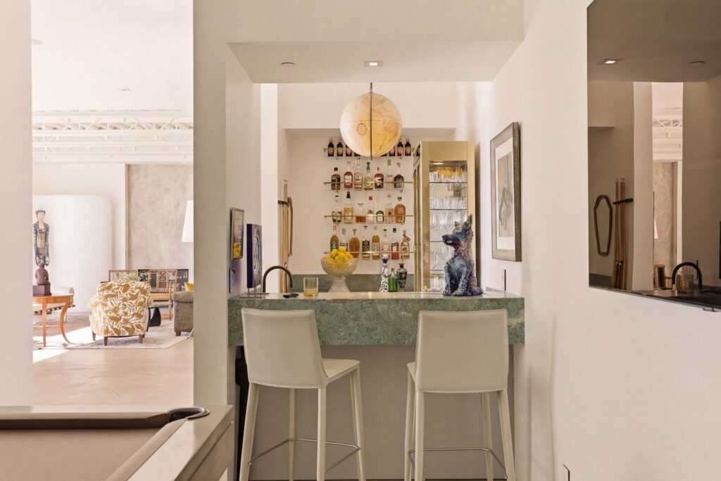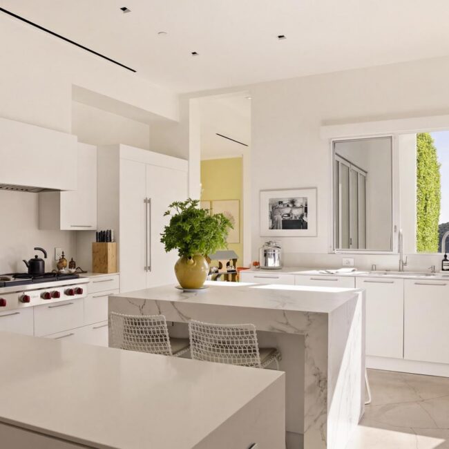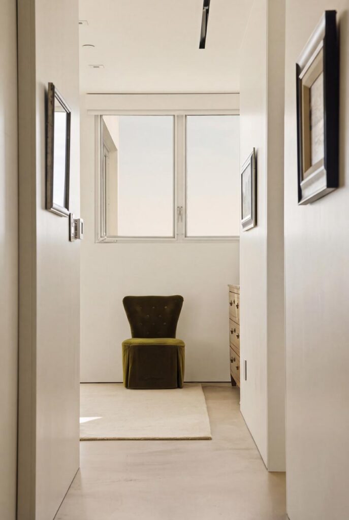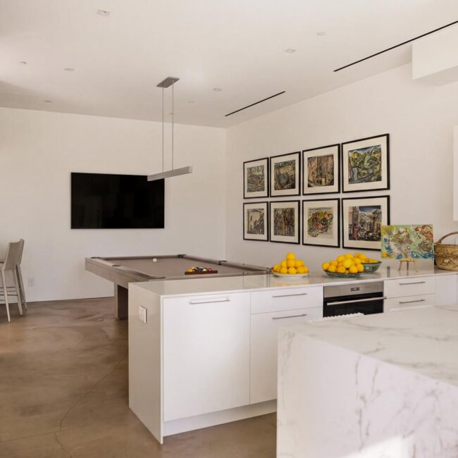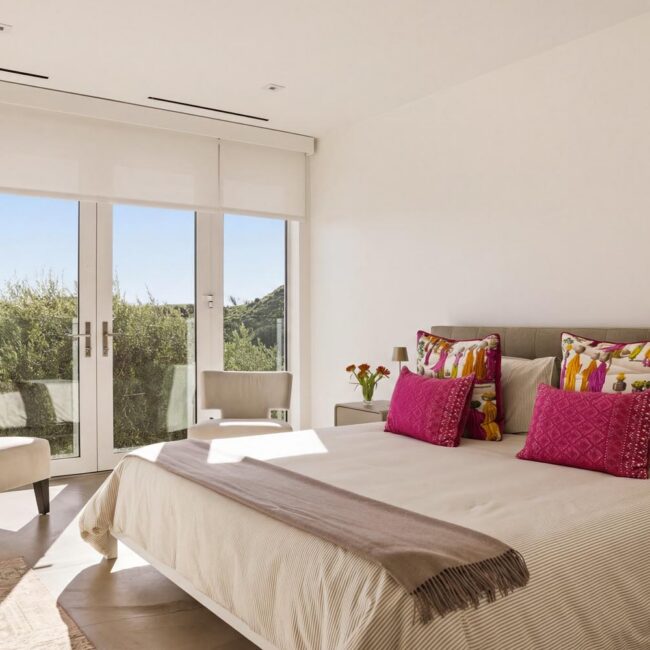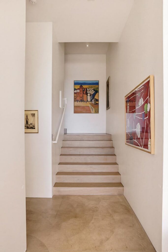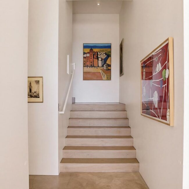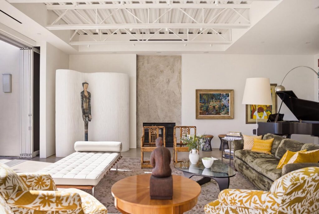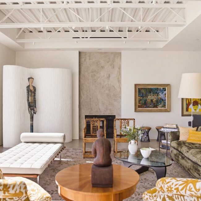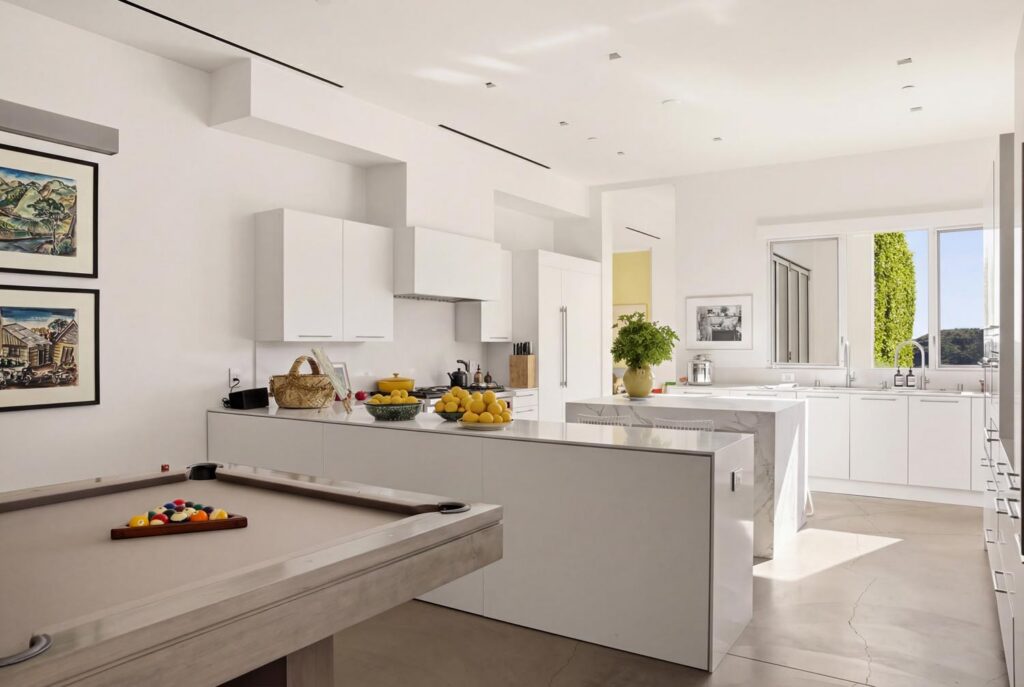 The home itself is defined by scale, clarity, and light. Expansive glass pocket doors dissolve the boundary between interior and exterior, opening the primary living space to a wide terrace and pool framed by mature hedges and an old olive tree. Polished concrete floors, white steel trusses, and restrained architectural lines create a clean, modern canvas softened by layered furnishings and collected artwork.