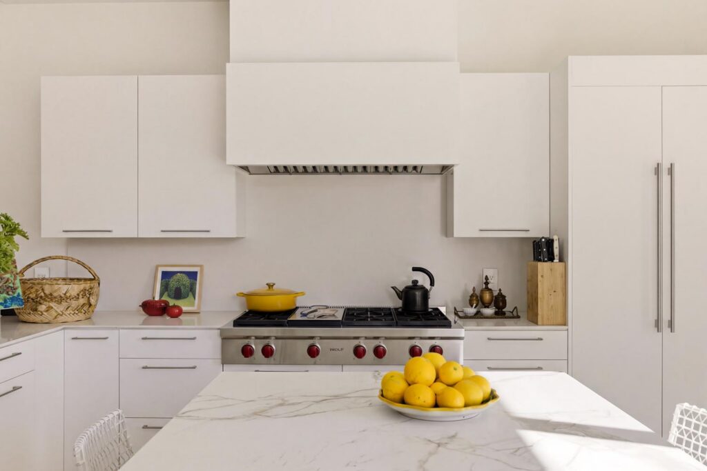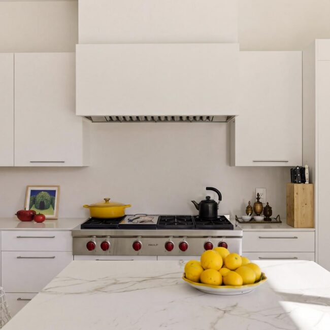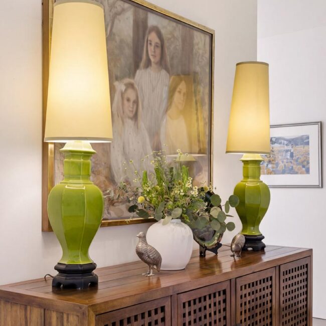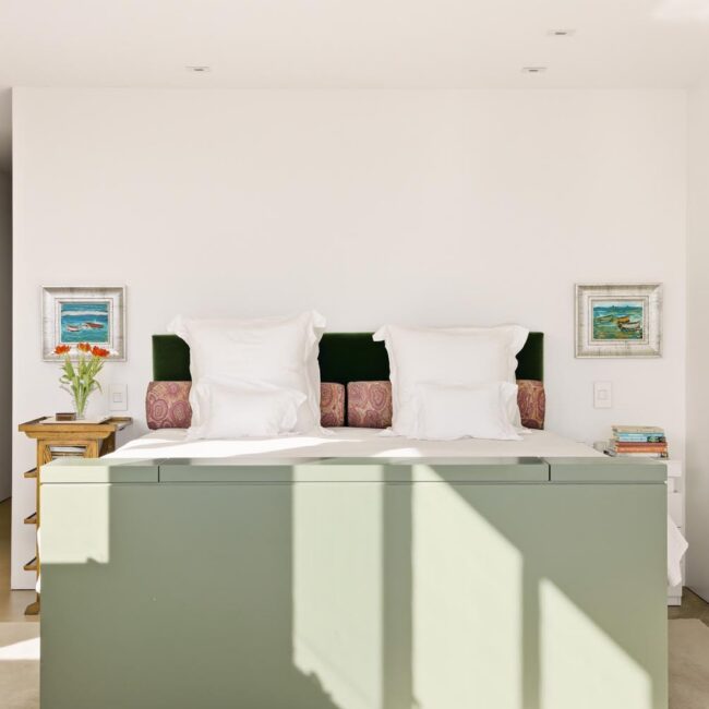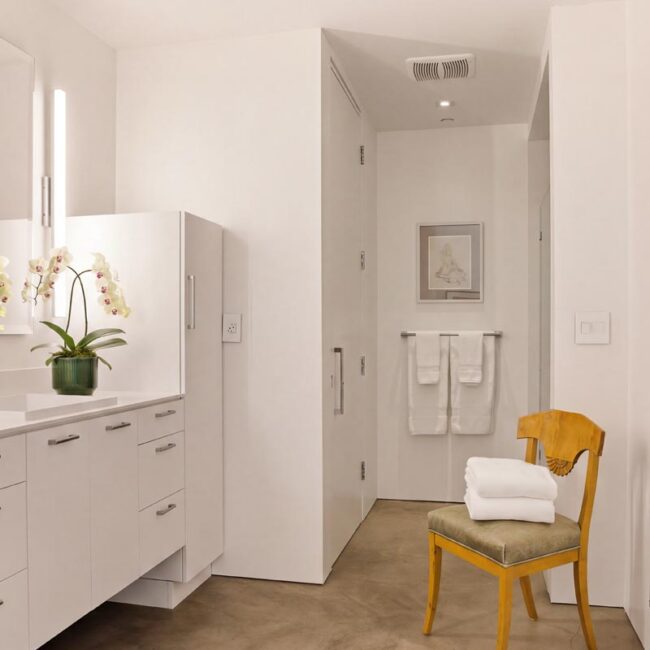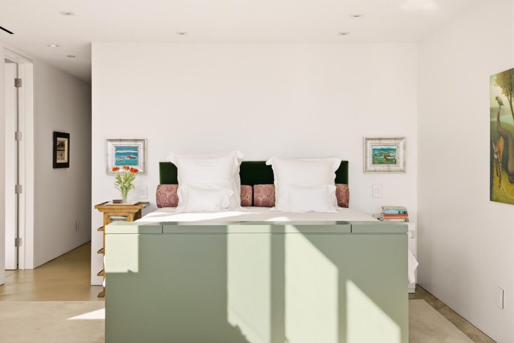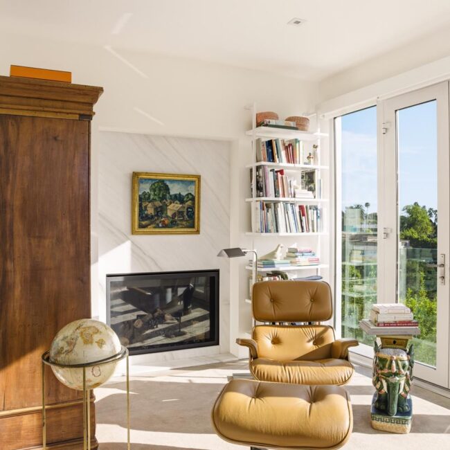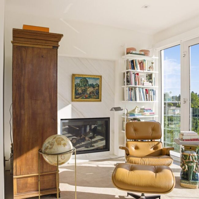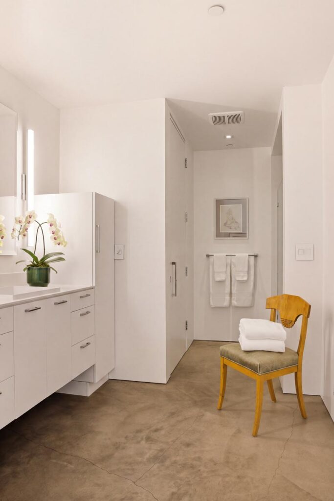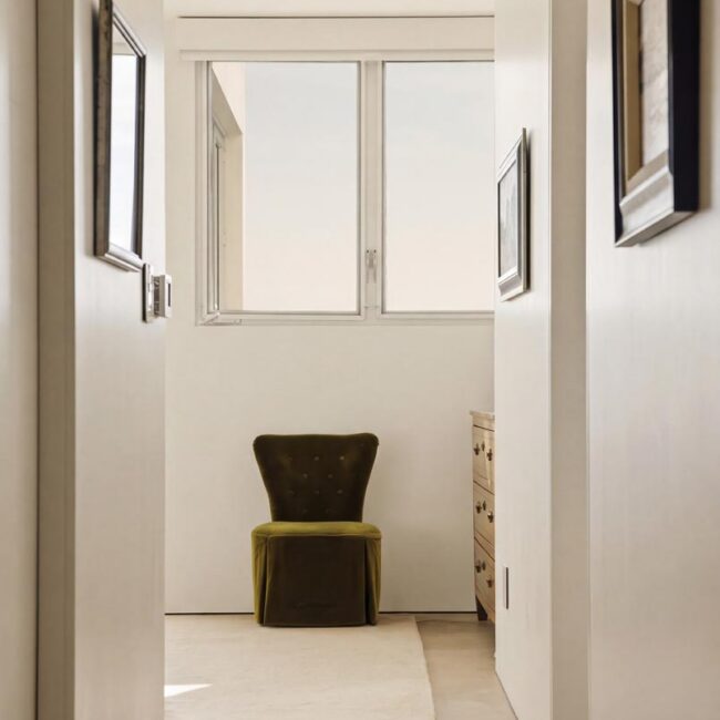 The home itself is defined by scale, clarity, and light. Expansive glass pocket doors dissolve the boundary between interior and exterior, opening the primary living space to a wide terrace and pool framed by mature hedges and an old olive tree. Polished concrete floors, white steel trusses, and restrained architectural lines create a clean, modern canvas softened by layered furnishings and collected artwork.
