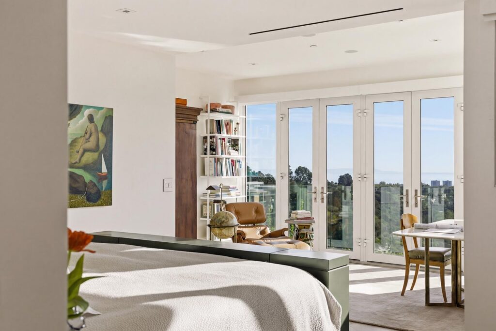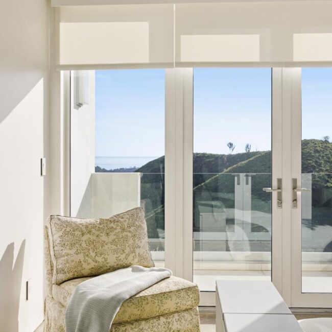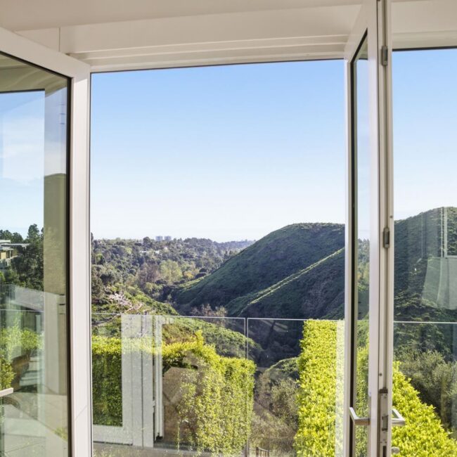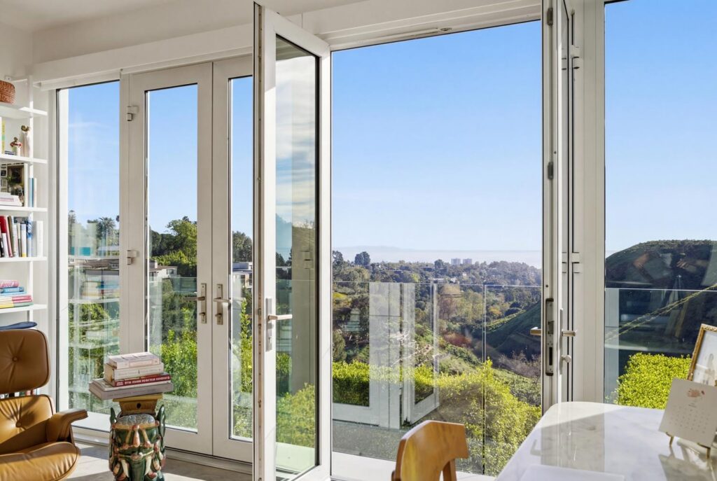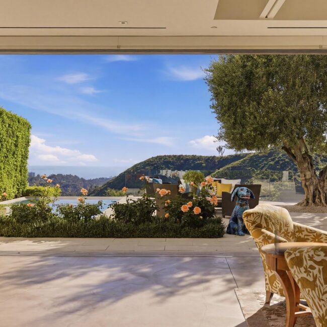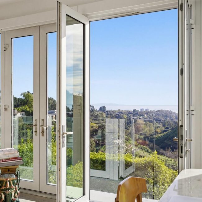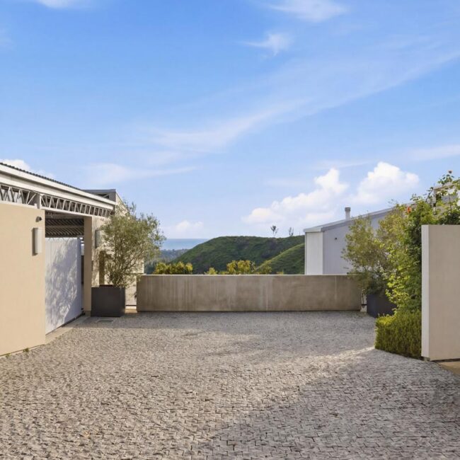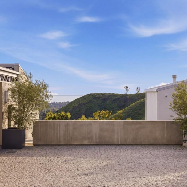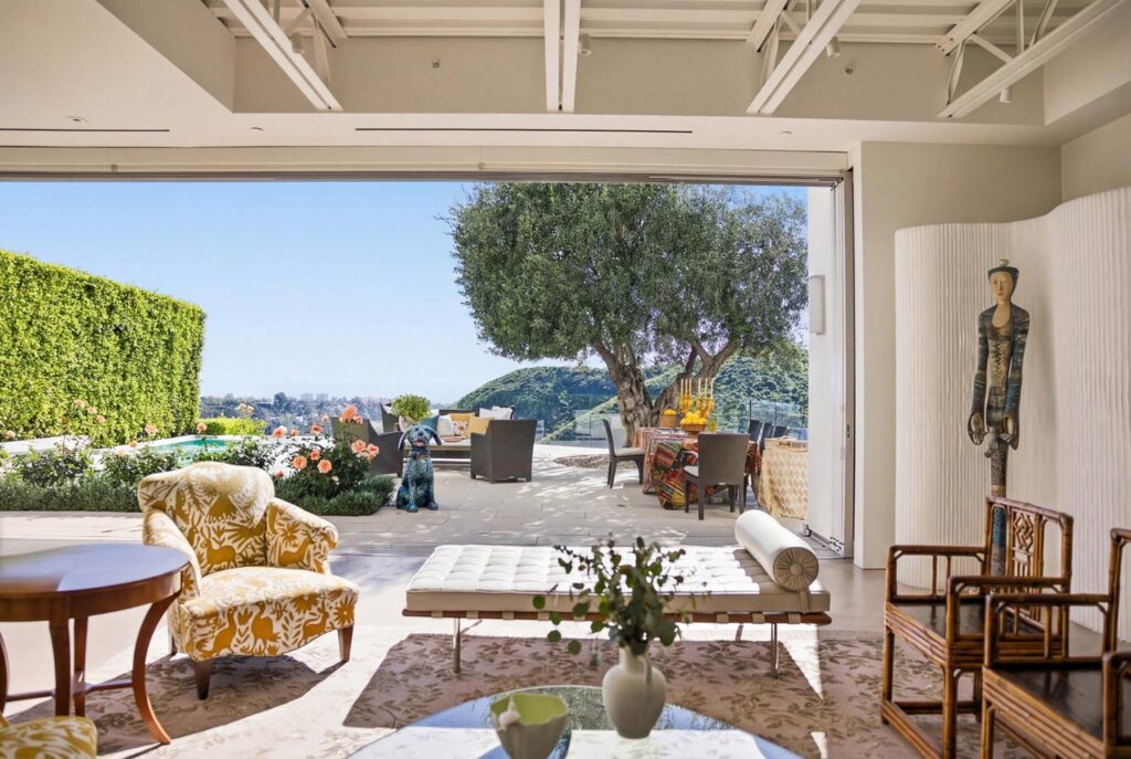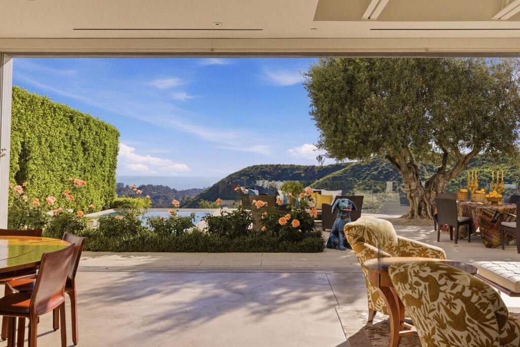 In the Upper Riviera, Flora Vista House sits suspended between canyon and ocean. The setting is unusually cinematic: rolling green hills drop away below, while the Pacific appears in the distance beyond the ridge line. From many vantage points throughout the property, the landscape unfolds with the feeling of floating above the canyon.
