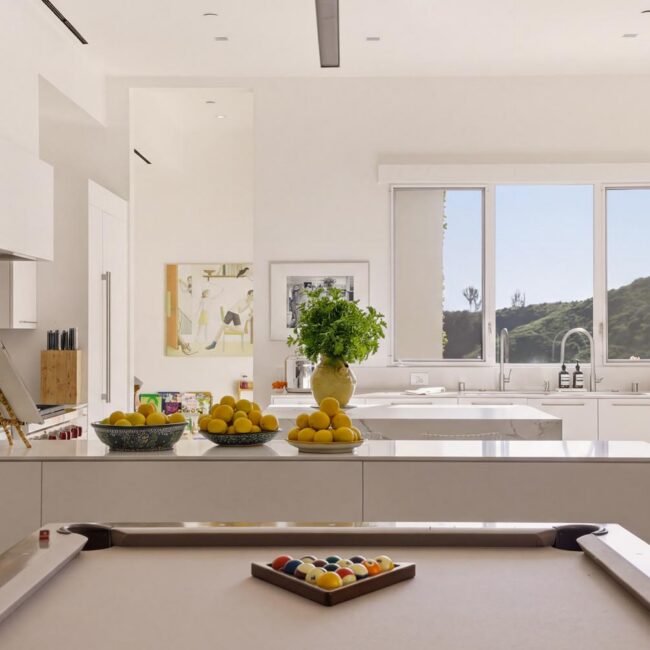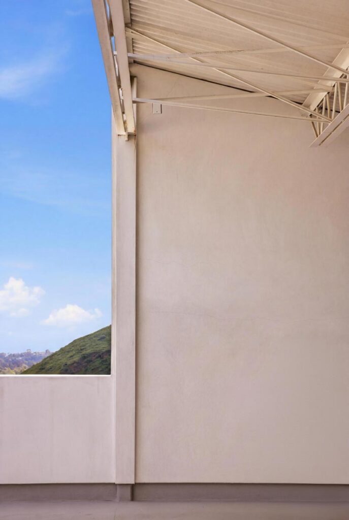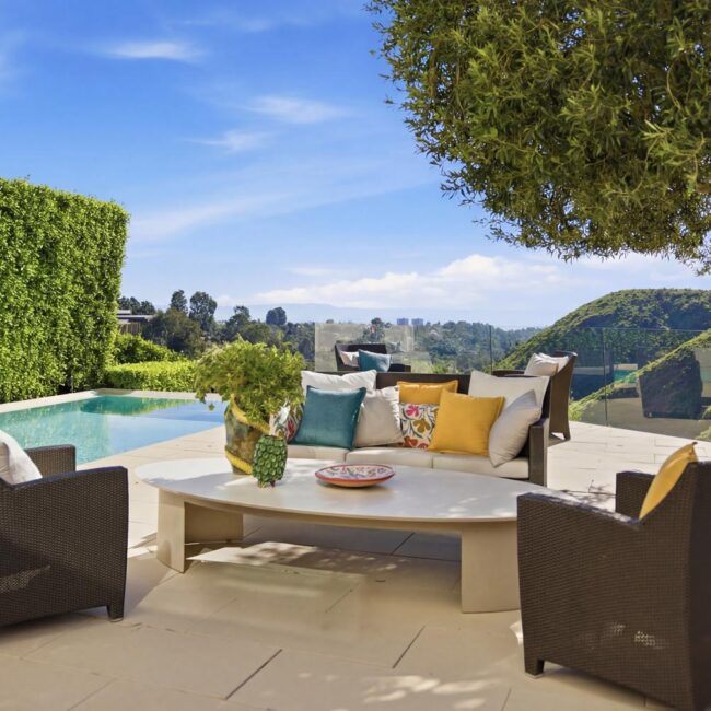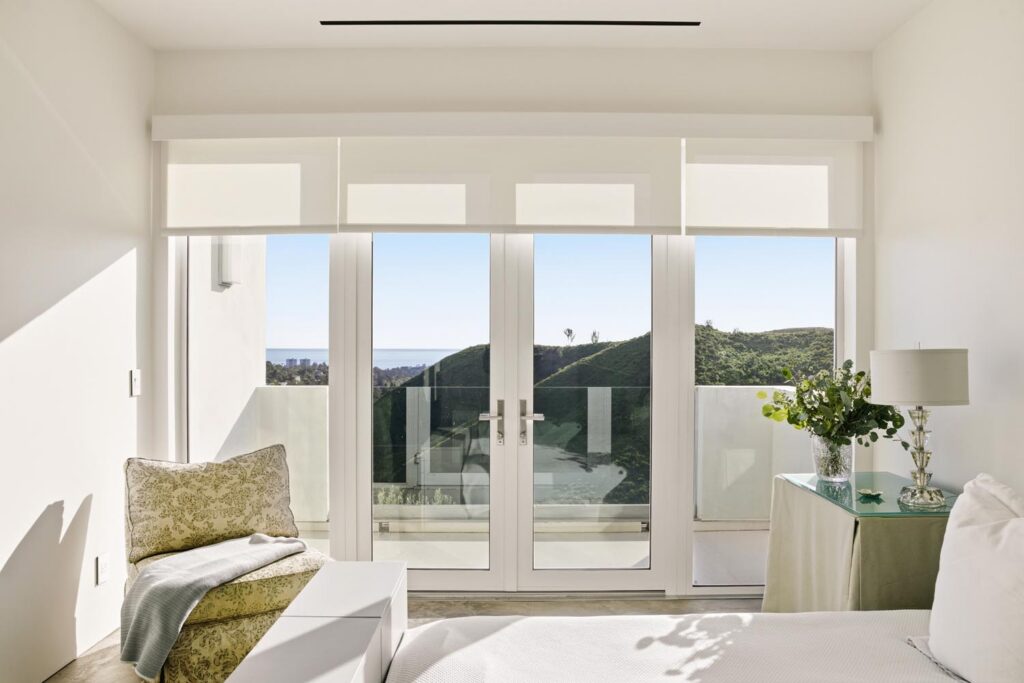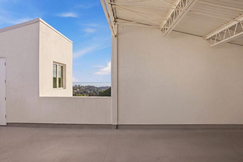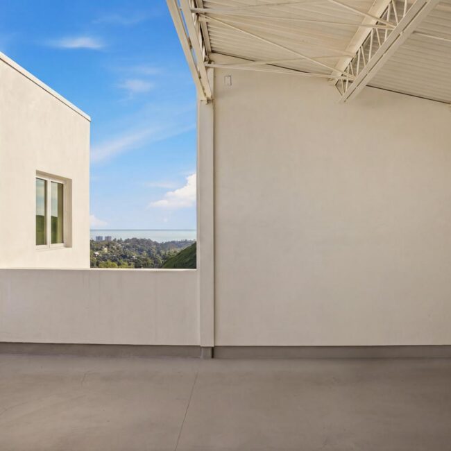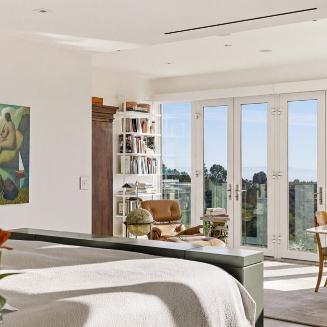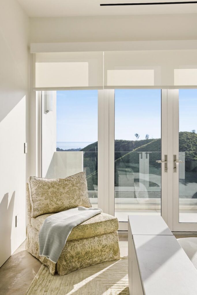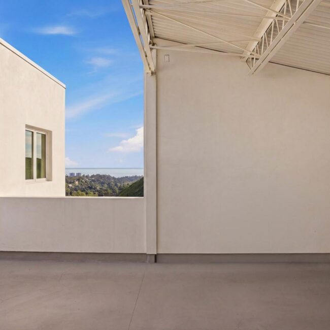 In the Upper Riviera, Flora Vista House sits suspended between canyon and ocean. The setting is unusually cinematic: rolling green hills drop away below, while the Pacific appears in the distance beyond the ridge line. From many vantage points throughout the property, the landscape unfolds with the feeling of floating above the canyon.