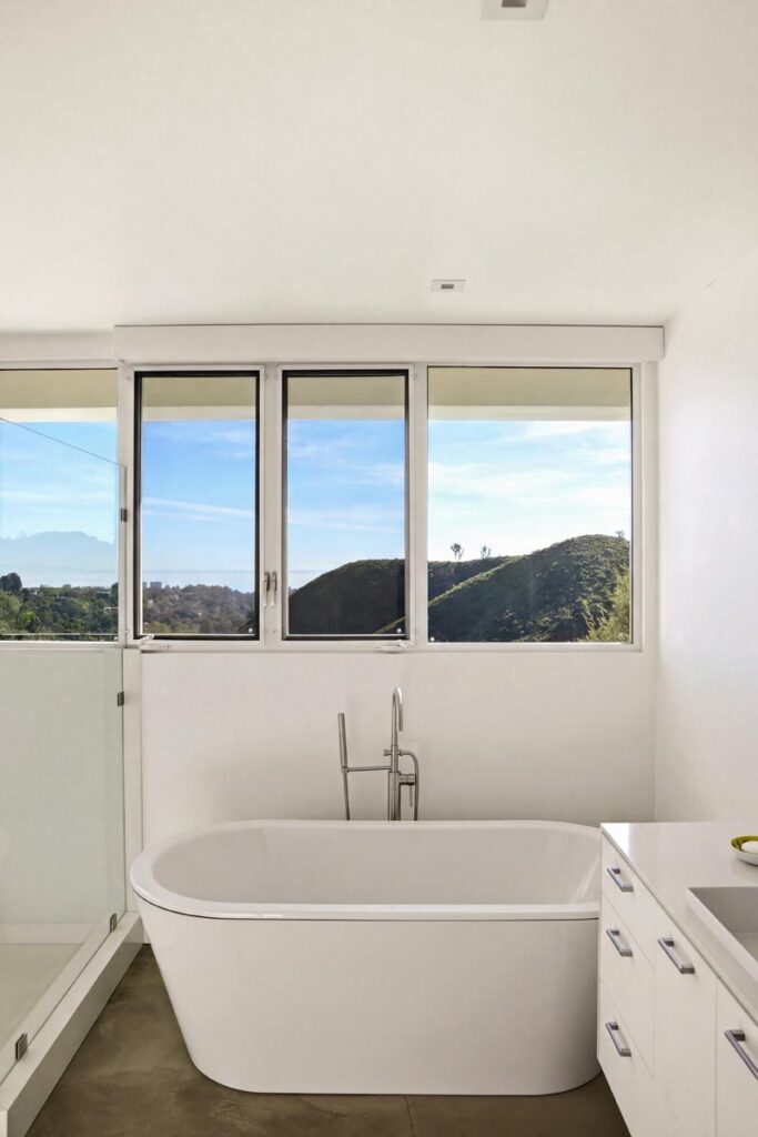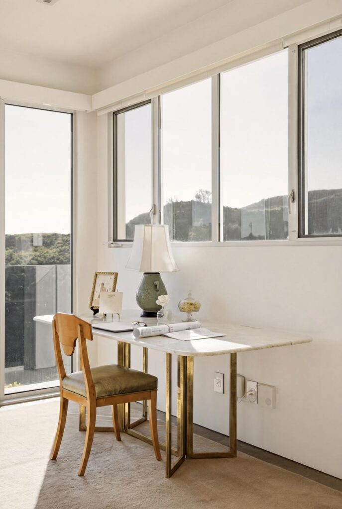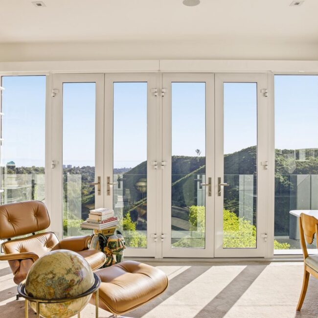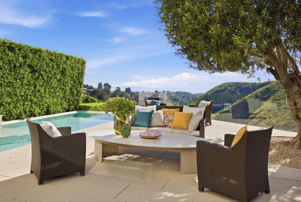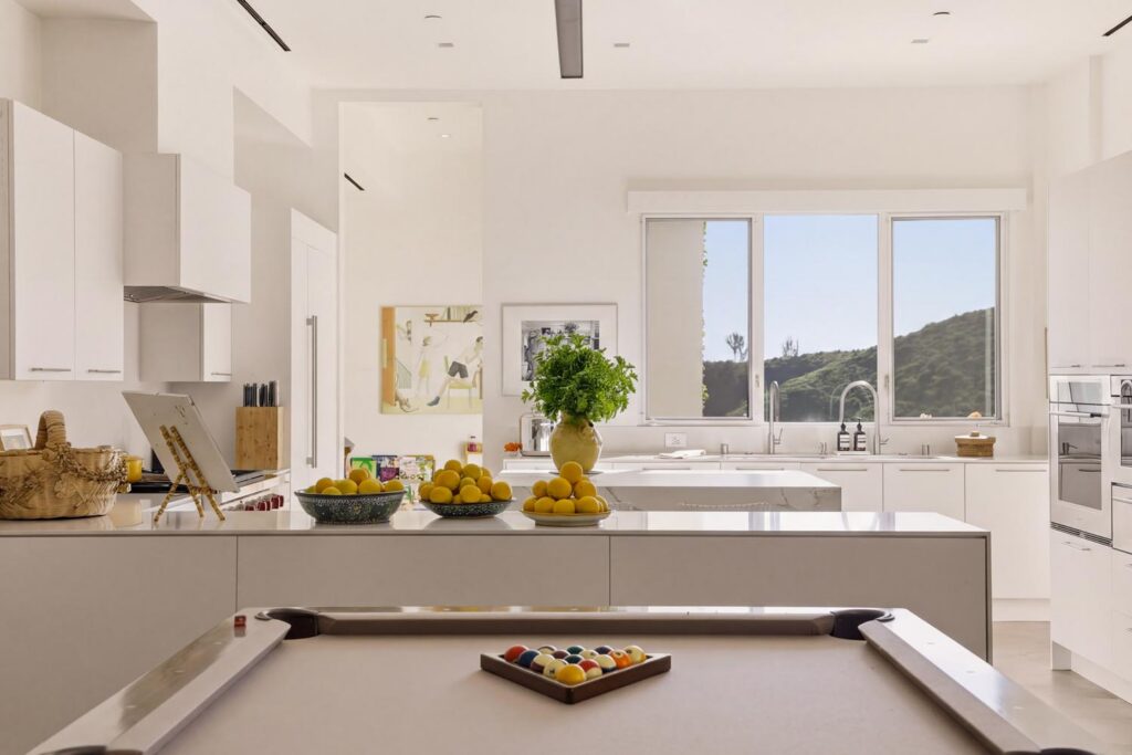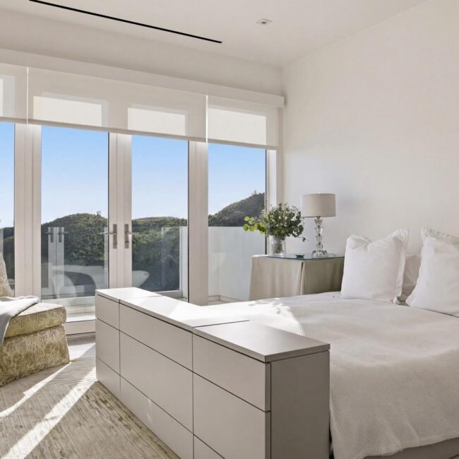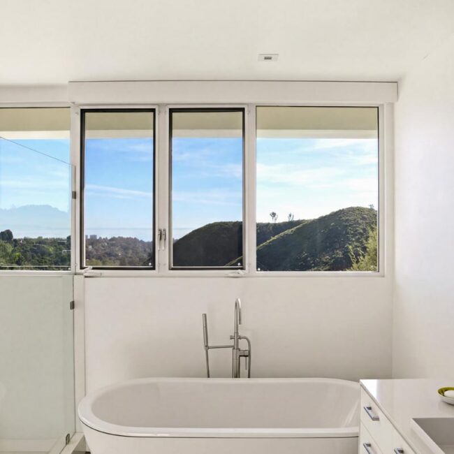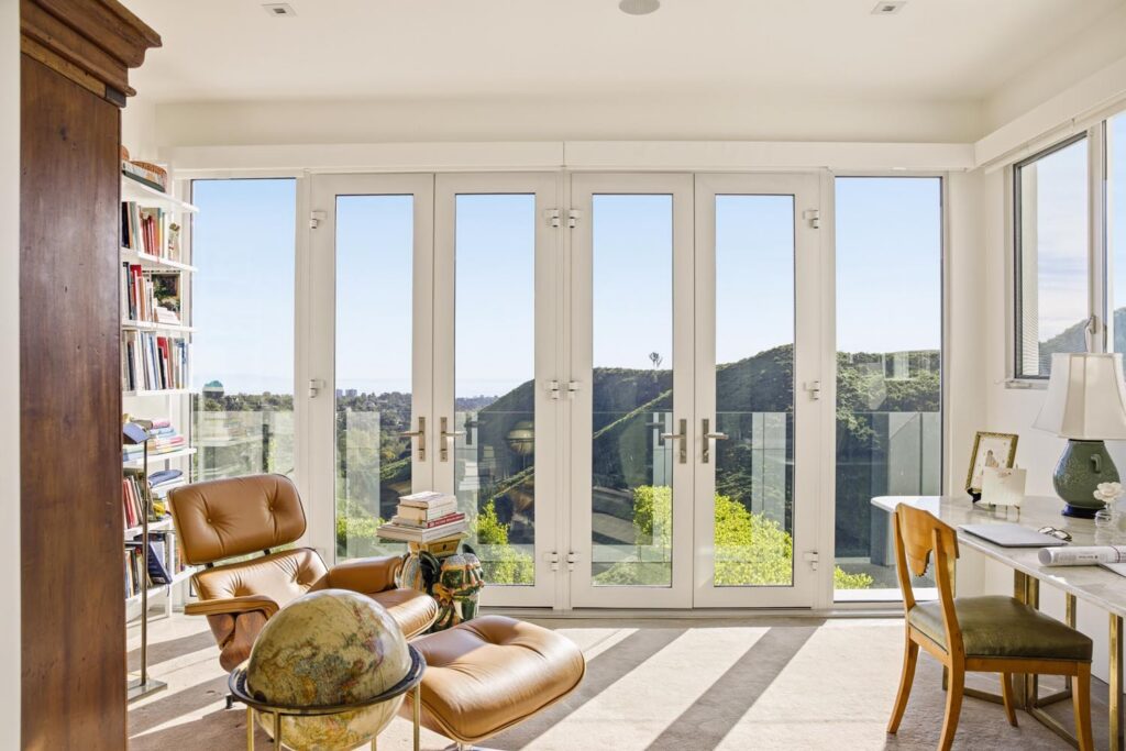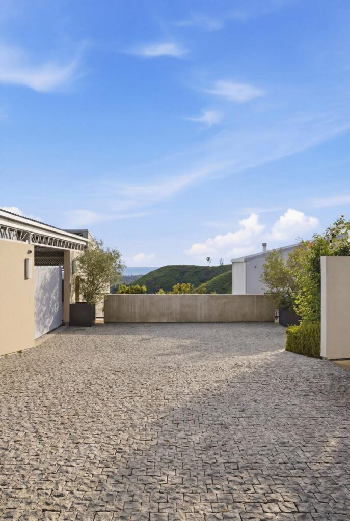 In the Upper Riviera, Flora Vista House sits suspended between canyon and ocean. The setting is unusually cinematic: rolling green hills drop away below, while the Pacific appears in the distance beyond the ridge line. From many vantage points throughout the property, the landscape unfolds with the feeling of floating above the canyon.