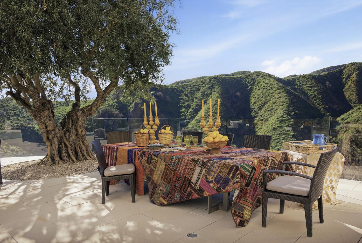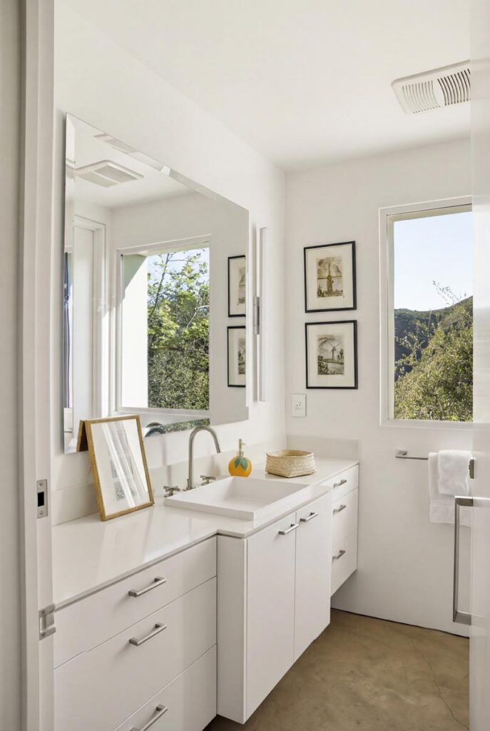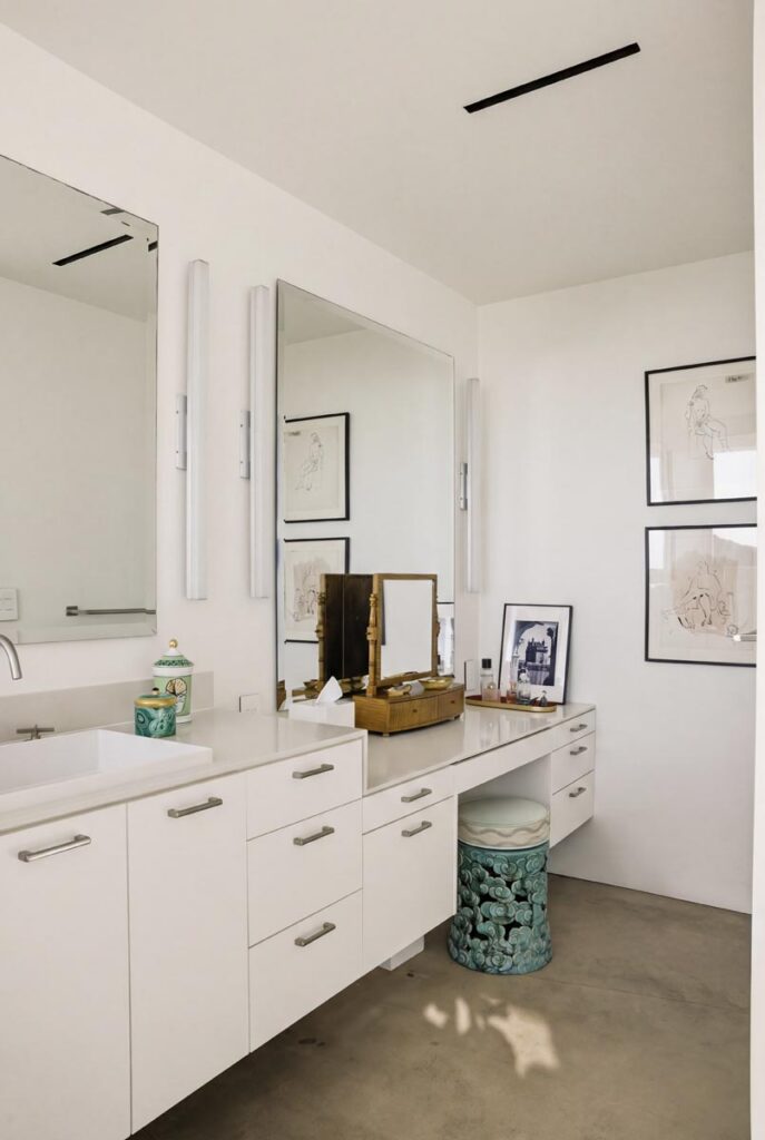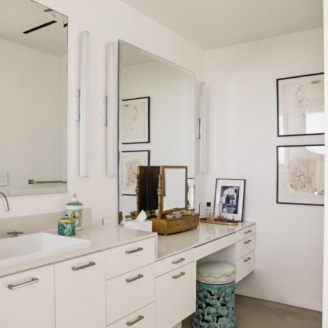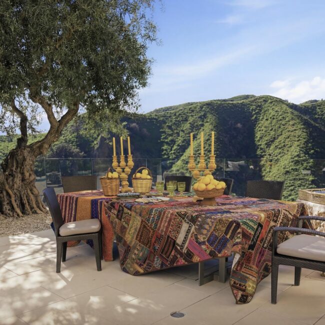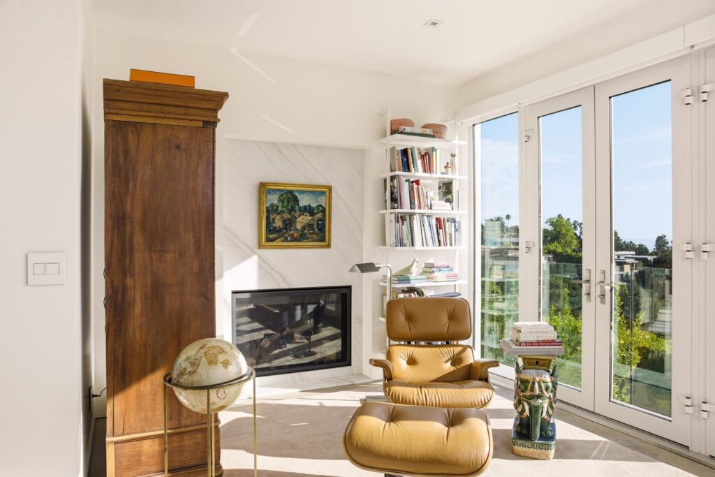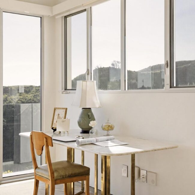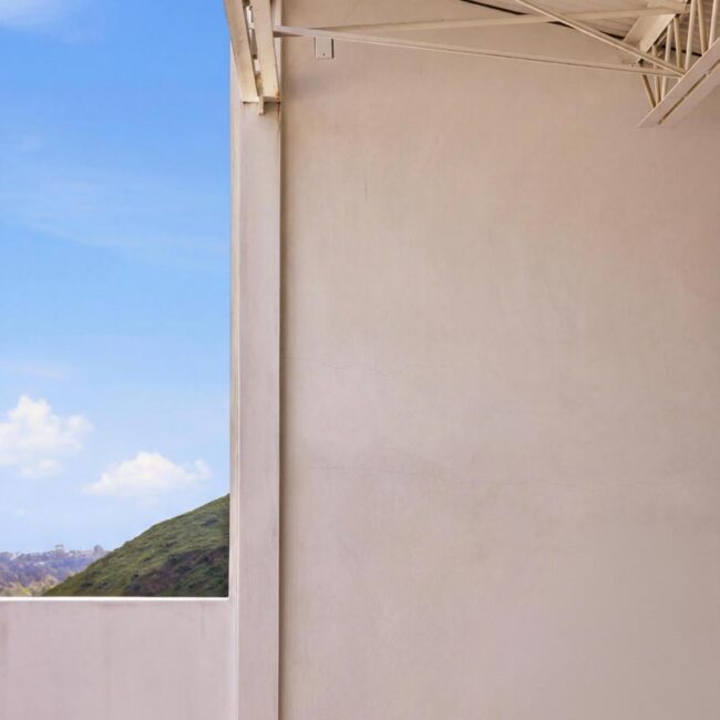 In the Upper Riviera, Flora Vista House sits suspended between canyon and ocean. The setting is unusually cinematic: rolling green hills drop away below, while the Pacific appears in the distance beyond the ridge line. From many vantage points throughout the property, the landscape unfolds with the feeling of floating above the canyon.