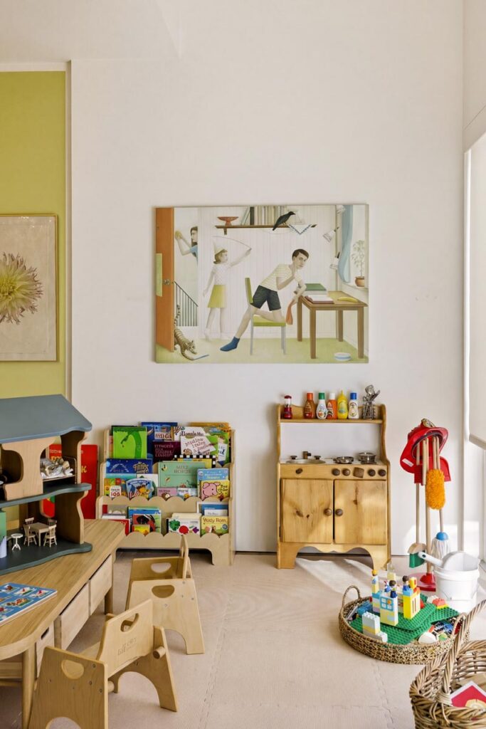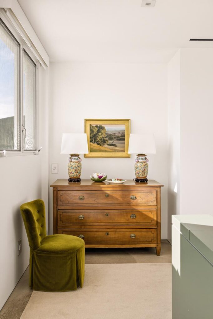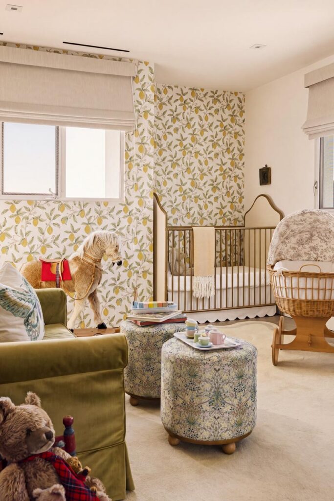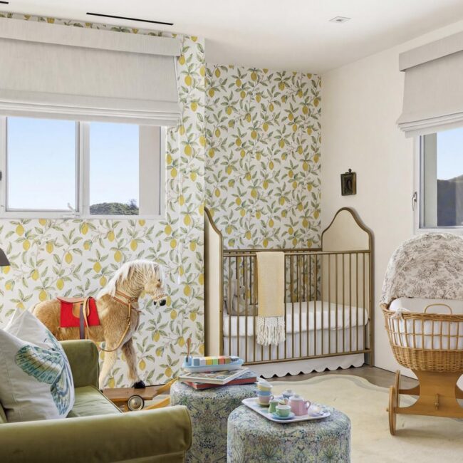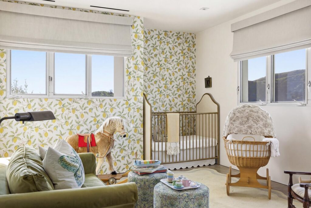 The open-air carport, positioned at the edge of the property, frames a striking ocean horizon—an unexpected arrival point that doubles as a scenic staging area. Inside, a thoughtfully curated nursery introduces warmth and character with patterned wallpaper, natural textures, and gentle daylight filtering through hillside windows.