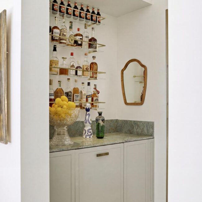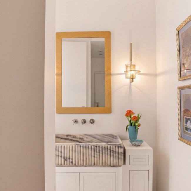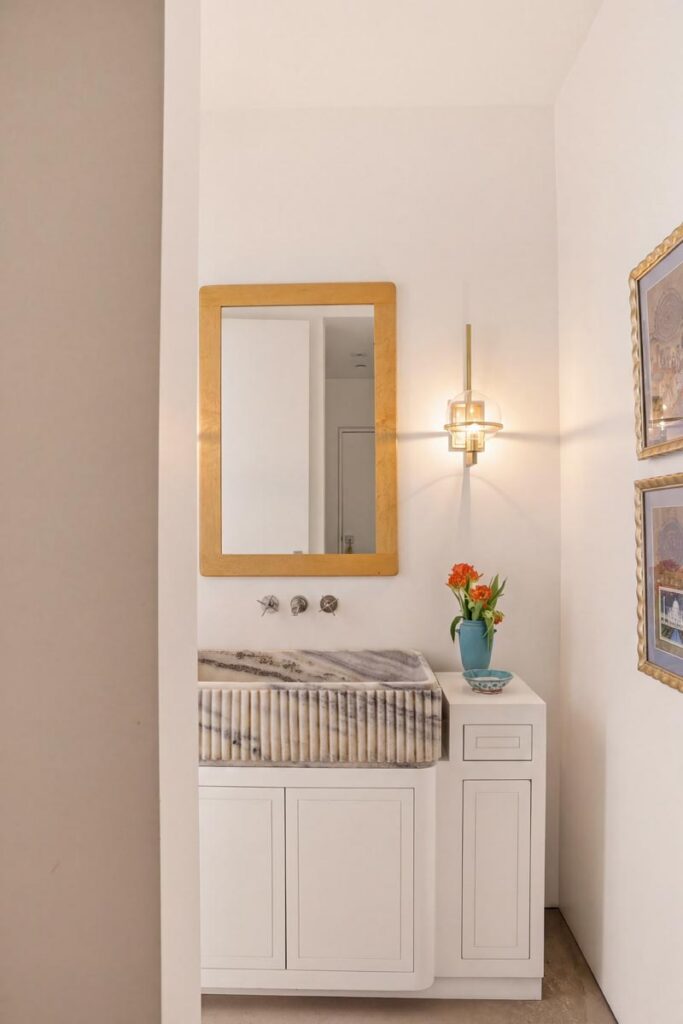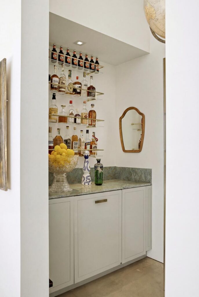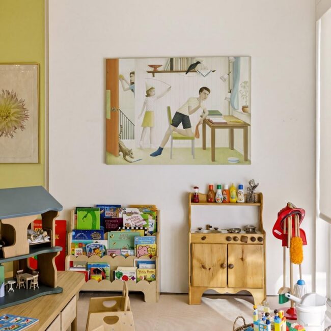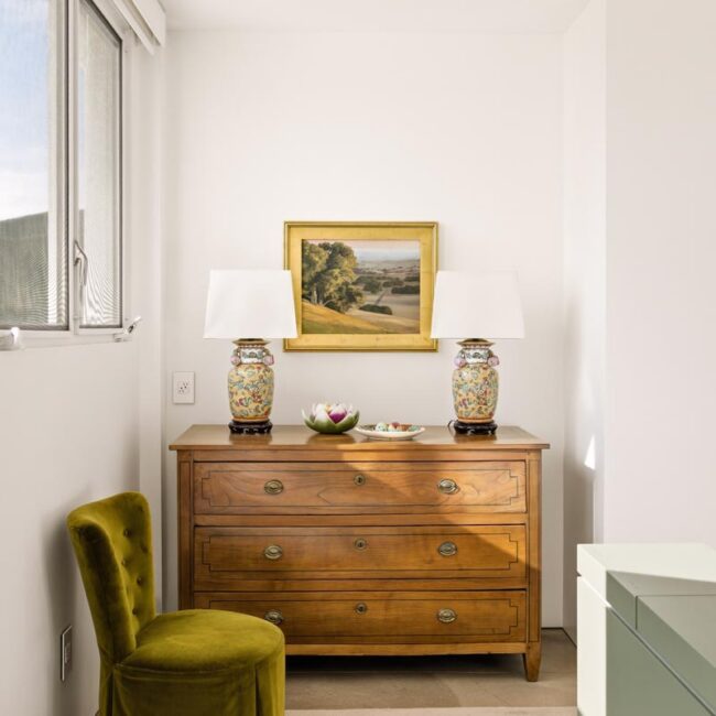 The open-air carport, positioned at the edge of the property, frames a striking ocean horizon—an unexpected arrival point that doubles as a scenic staging area. Inside, a thoughtfully curated nursery introduces warmth and character with patterned wallpaper, natural textures, and gentle daylight filtering through hillside windows.