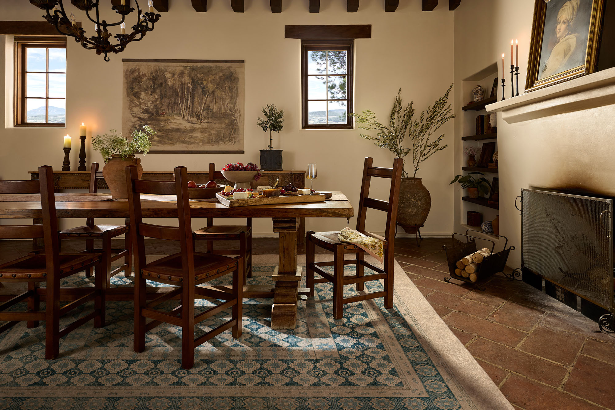 Spanish villa dining room with wood-beamed ceiling, rustic table, and wrought-iron chandelier