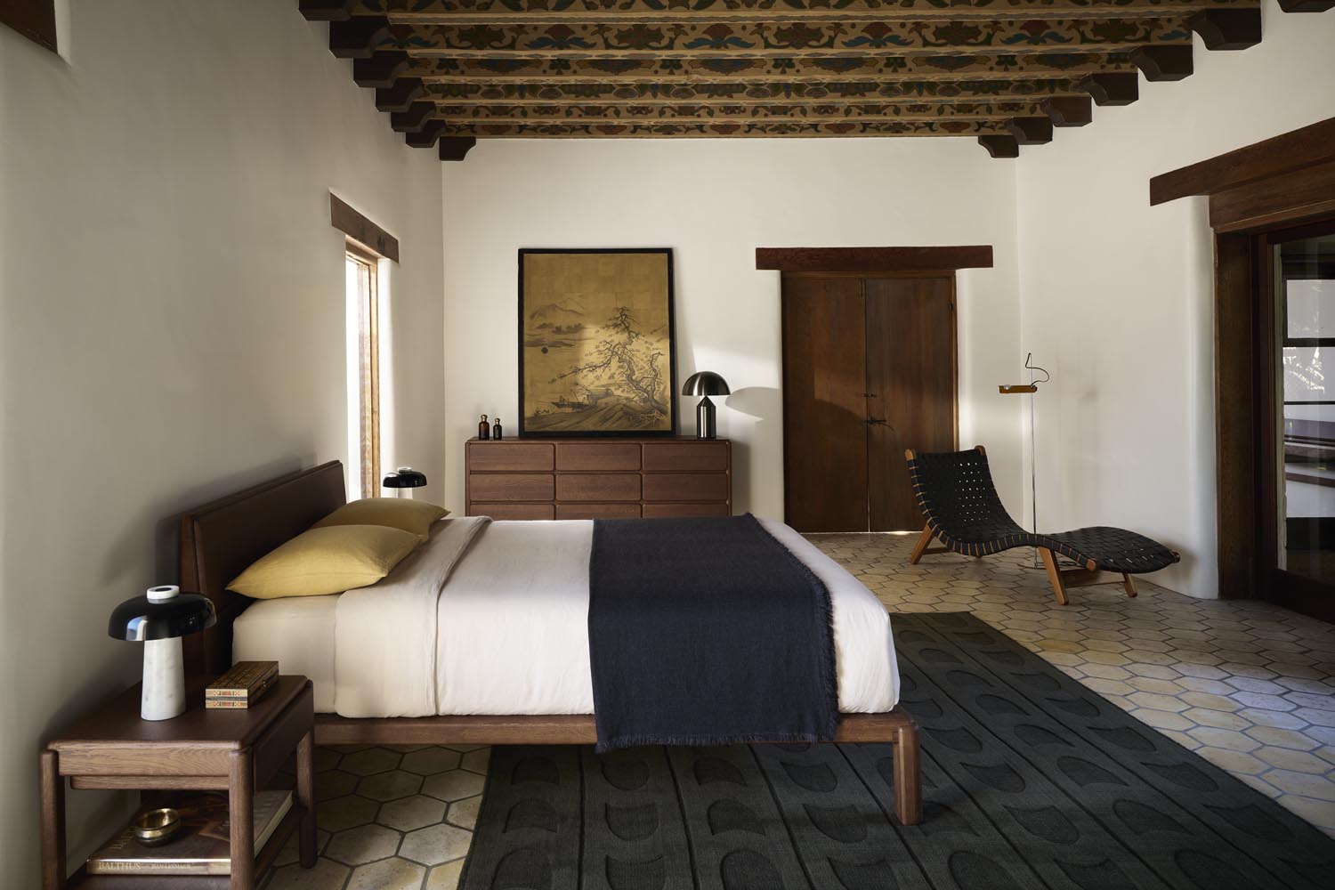 Spanish villa bedroom with wood-beamed ceiling, white stucco walls, and vintage furniture